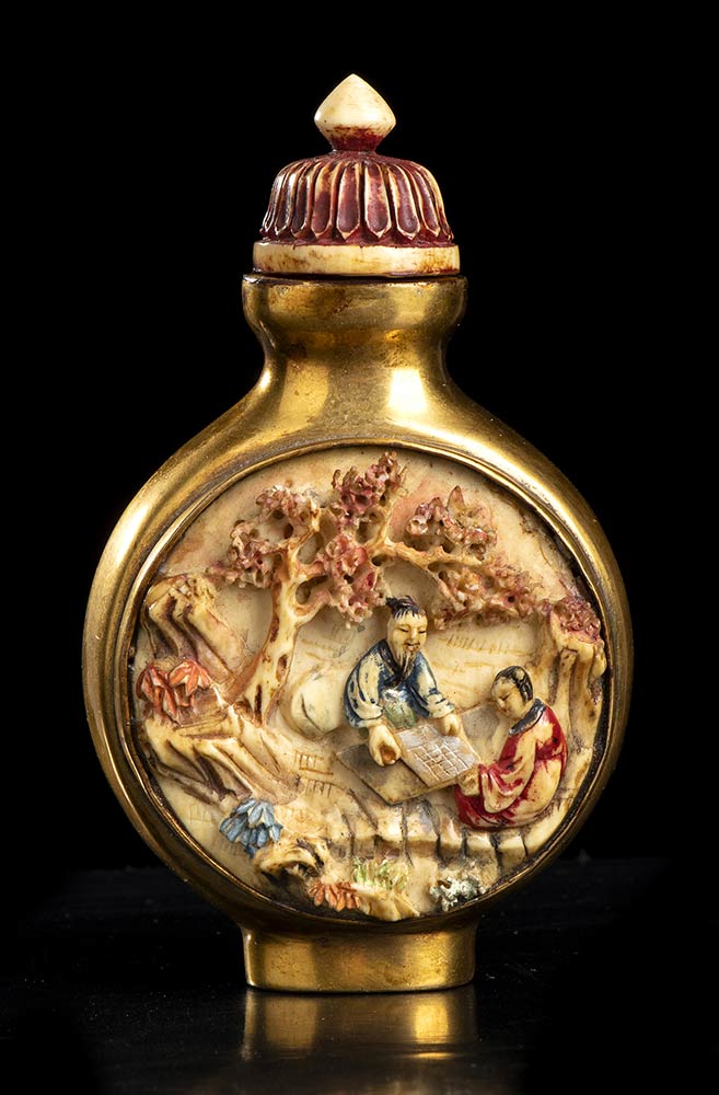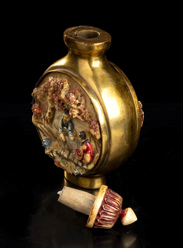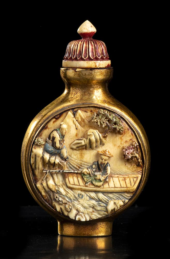 SNUFF BOTTLE IN METALLO DORATO E AVORIO DIPINTO Cina, dinastia Qing, XIX secolo