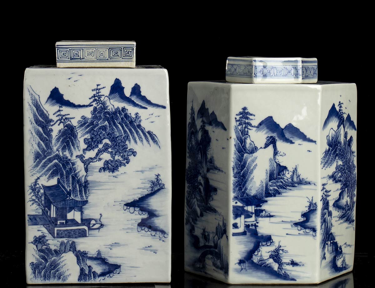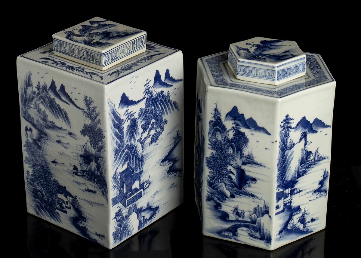 Uno a sezione quadrata e l'altro a sezione esagonale, entrambi decorati con scene di paesaggio lacustre, con monti, alberi, padiglioni, barche e figure, marchio a sei caratteri al centro della base di uno.