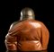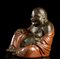 Seduto con la gamba destra sollevata al ginocchio sul quale posa la mano con il rosario, la mano sinistra a tenere un lembo dell'ampio abito che lascia scoperto il ventre prominente, l'espressione del volto sorridente, tracce di doratura.