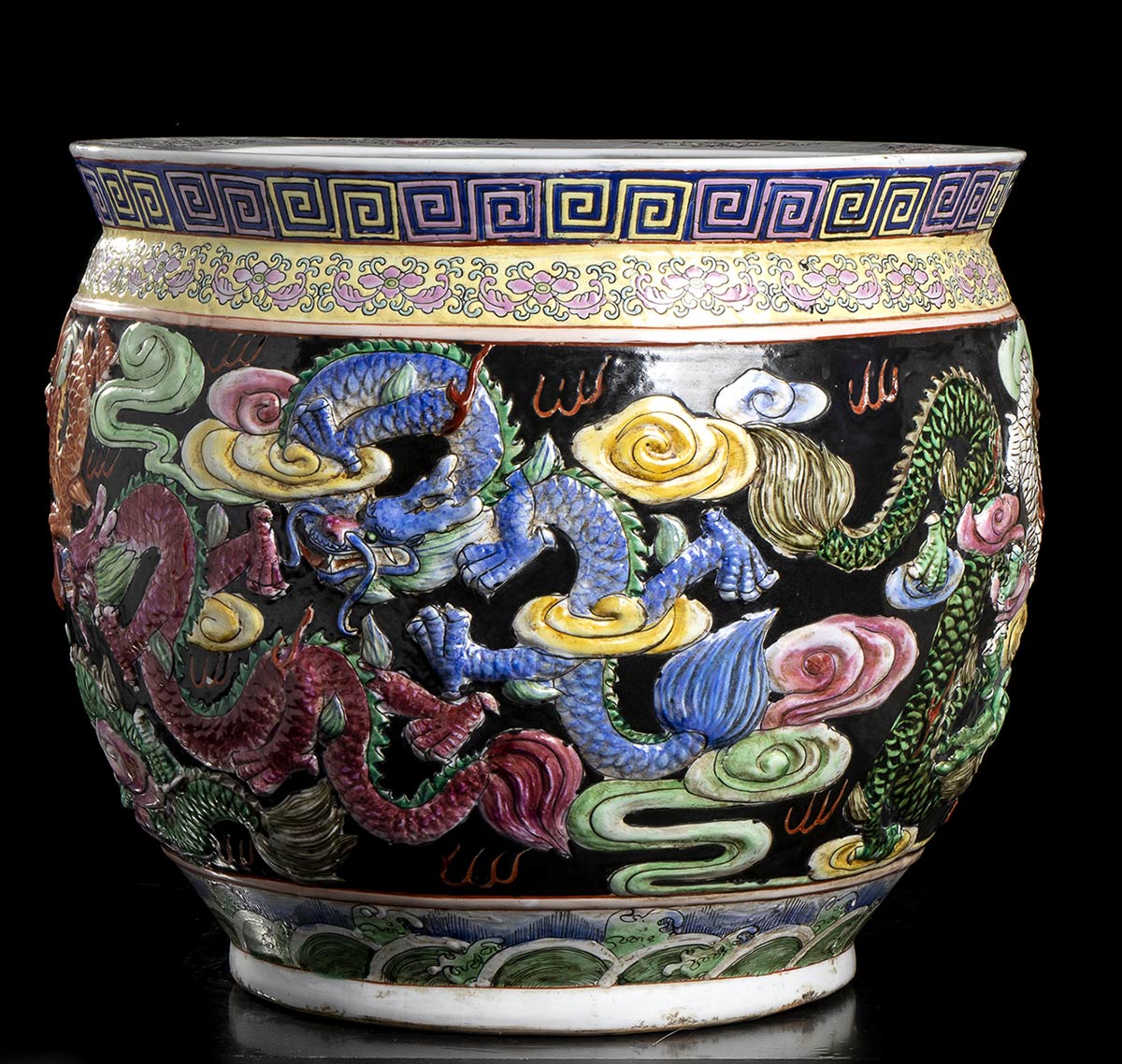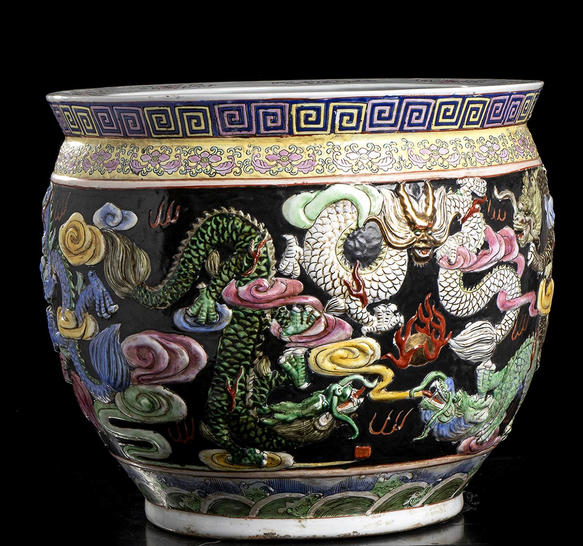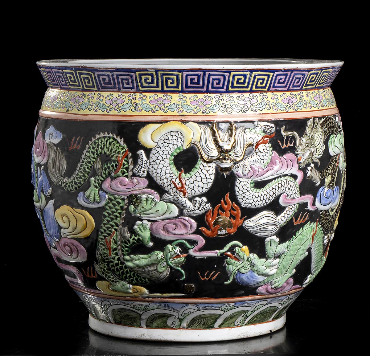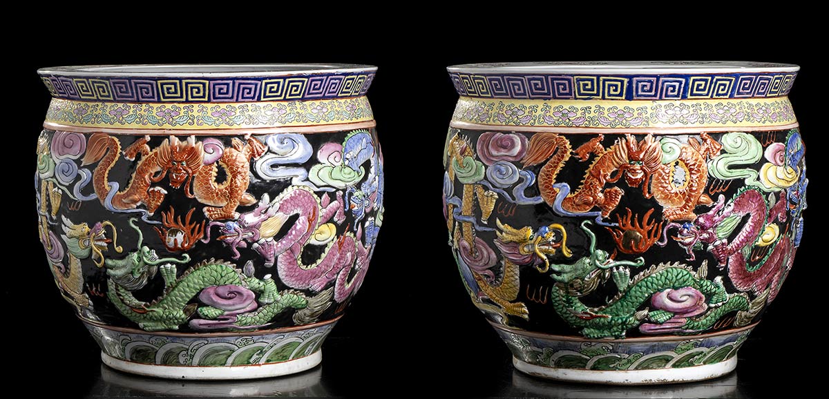 Decorati sull'esterno con draghi a leggero rilievo in volo tra nuvole e dardi, verso la base una fascia con onde marine, verso l'orlo una banda con motivi floreali e una con meandro di greche, all'interno pesci rossi e erbe acquatiche, marchio apocrifo di Qianlong.