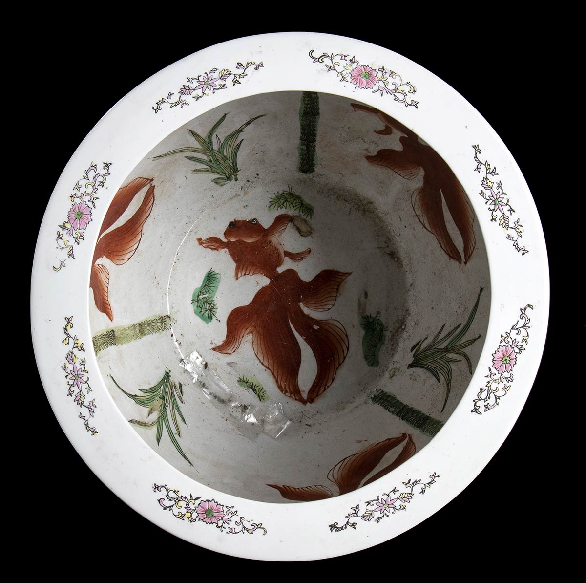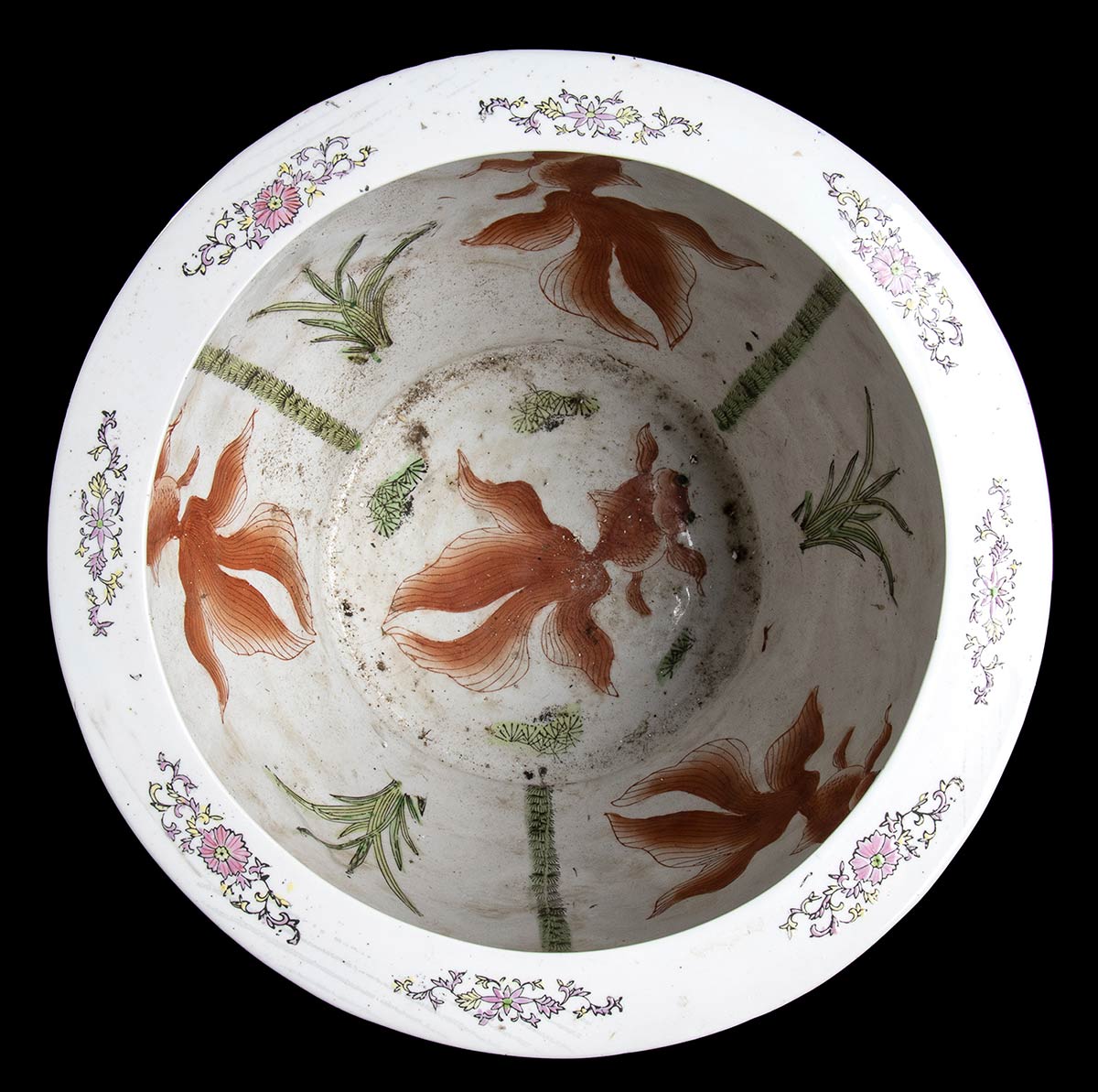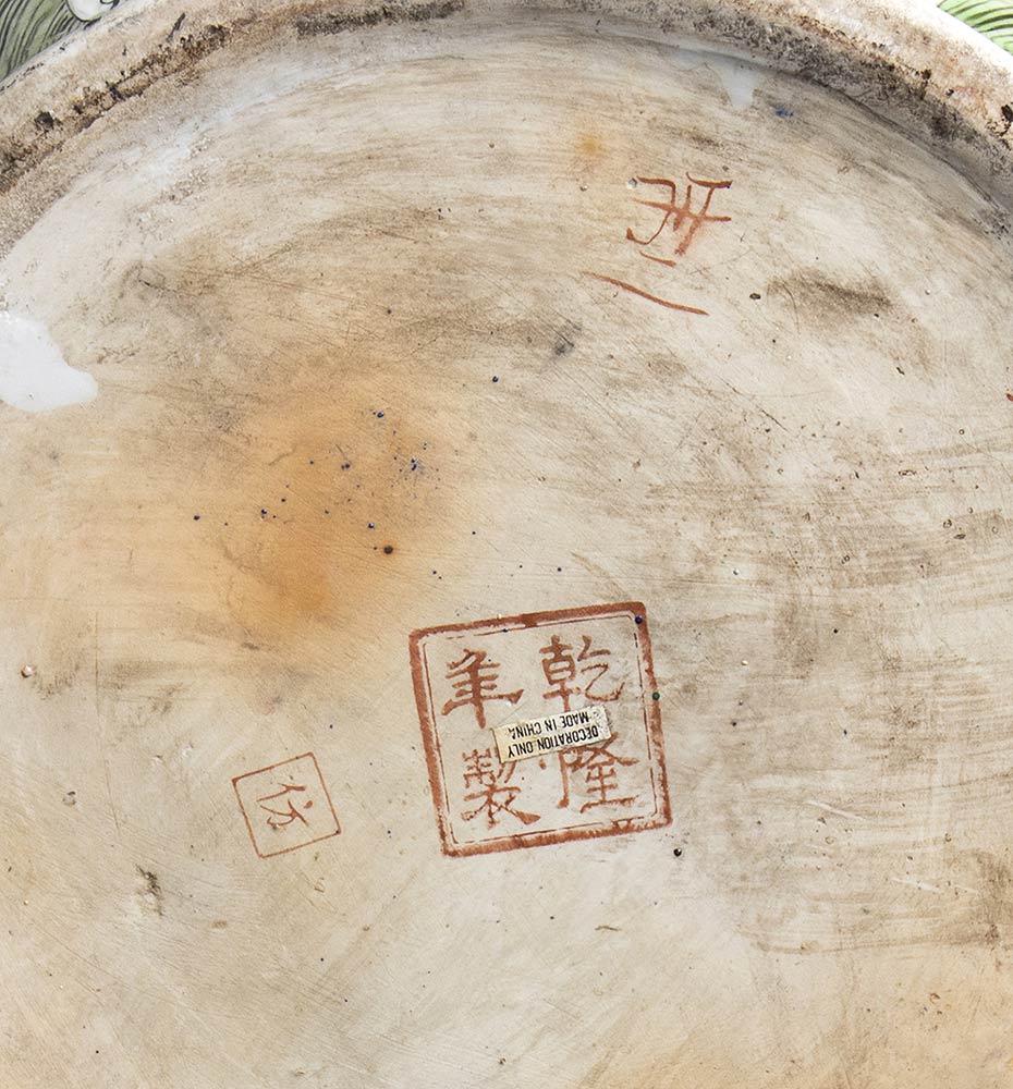 Decorati sull'esterno con draghi a leggero rilievo in volo tra nuvole e dardi, verso la base una fascia con onde marine, verso l'orlo una banda con motivi floreali e una con meandro di greche, all'interno pesci rossi e erbe acquatiche, marchio apocrifo di Qianlong.