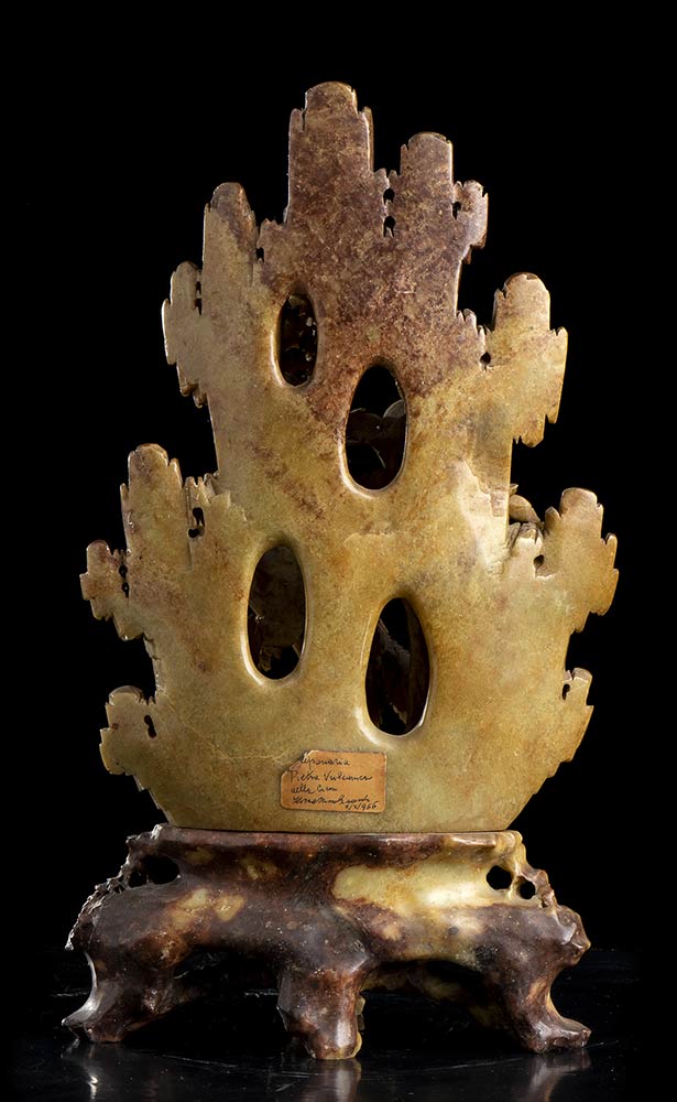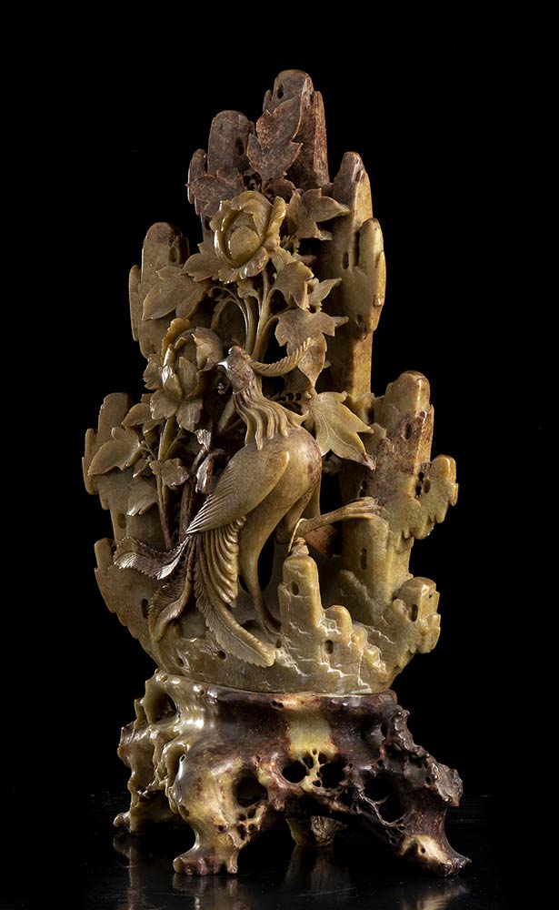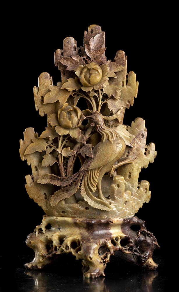 COMPOSIZIONE DI FIORI E UCCELLI IN PIETRA SAPONARIA Cina, XX secolo