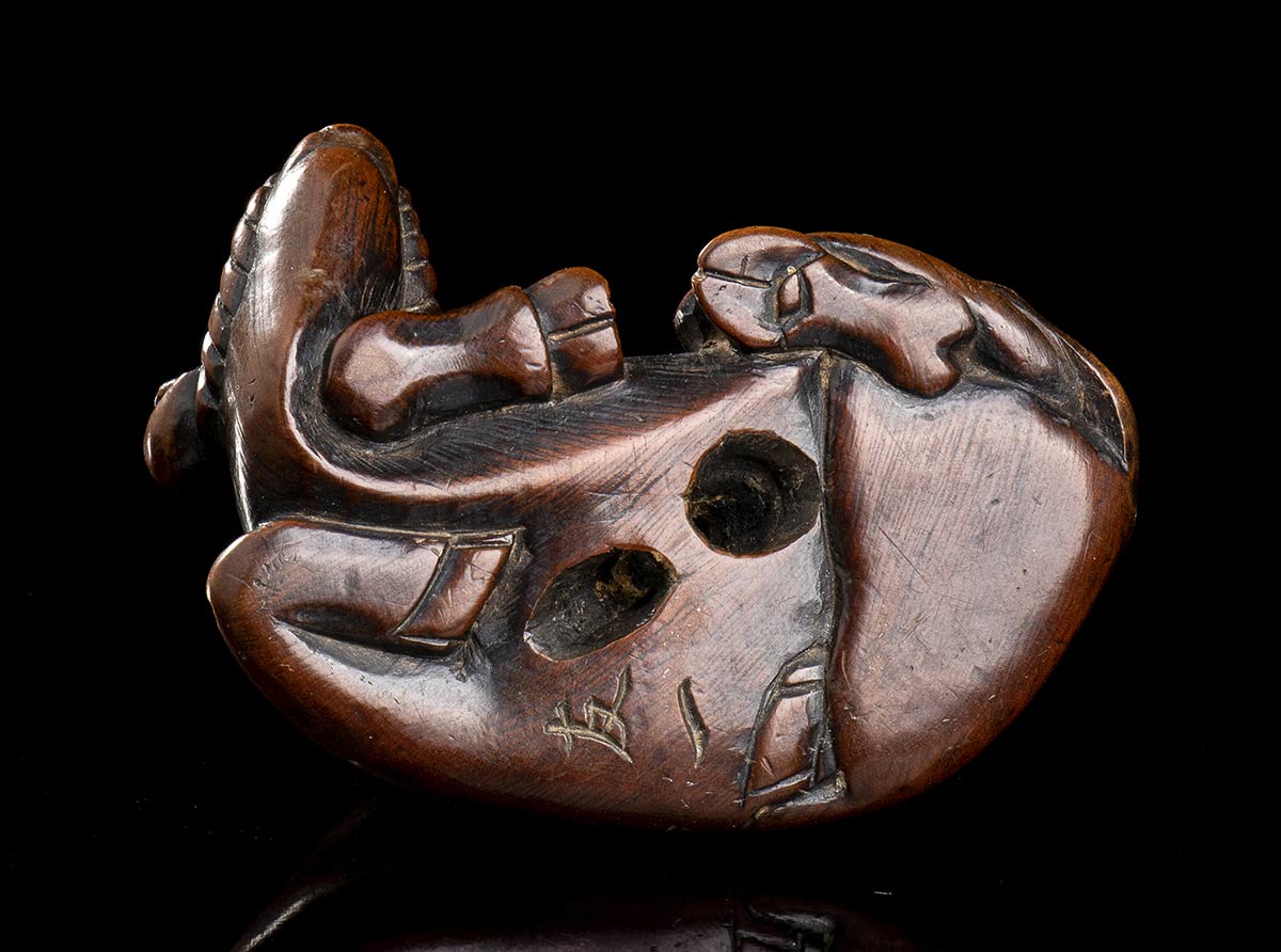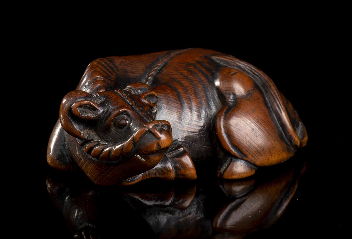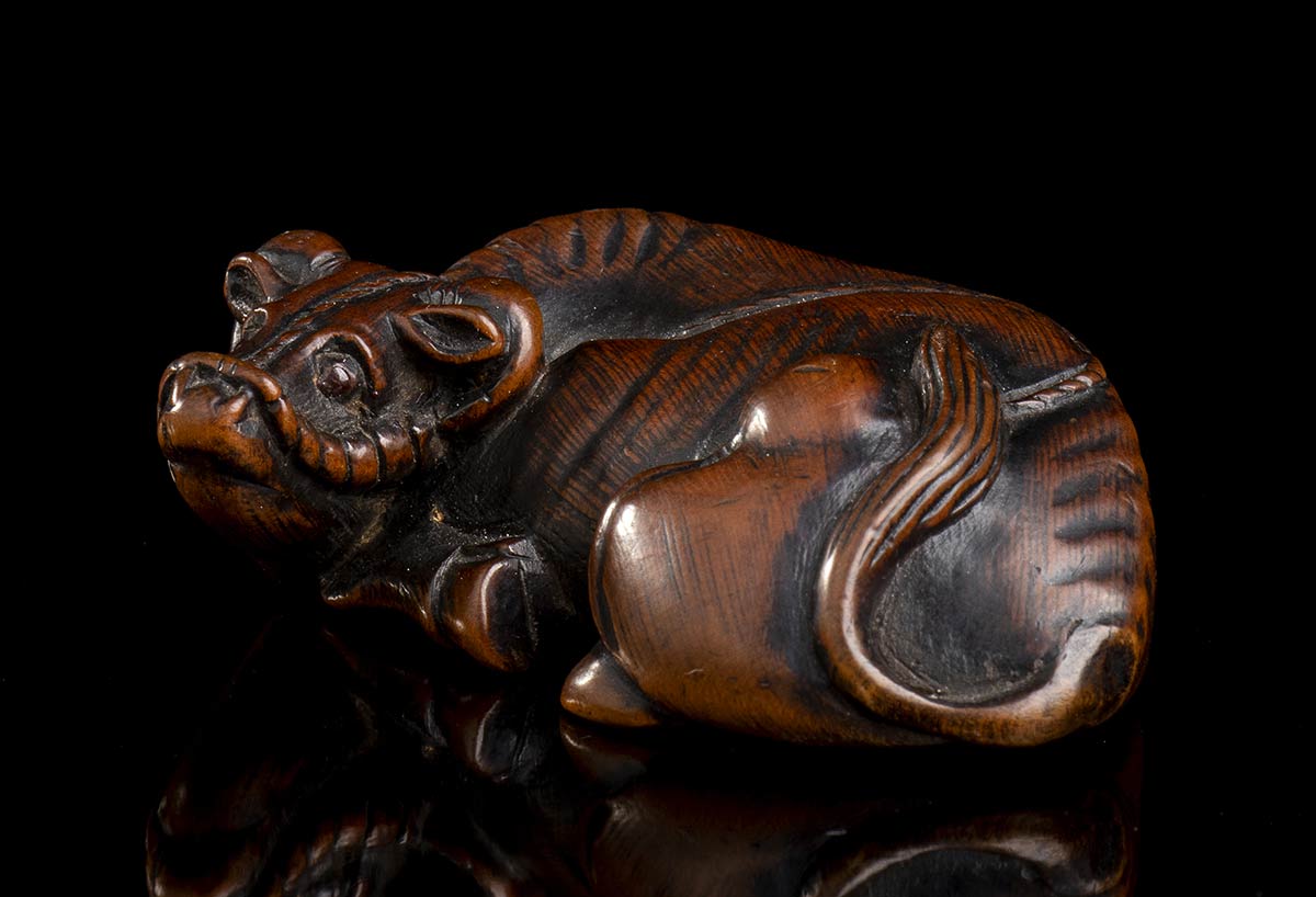 Lotto 195 | NETSUKE IN LEGNO DI BOSSO CON BUE SDRAIATO Giappone, periodo Edo, XIX secolo