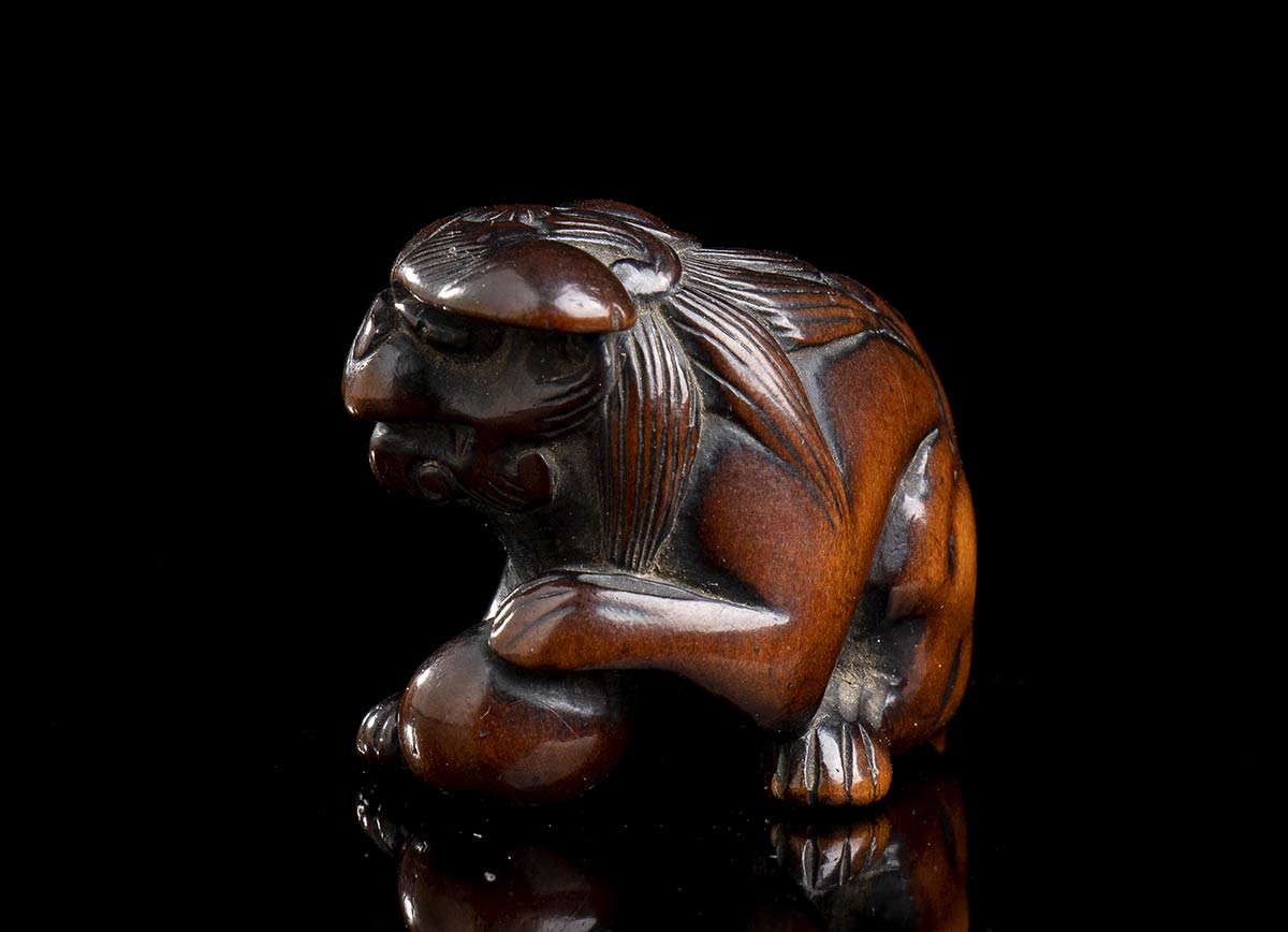 NETSUKE IN LEGNO DI BOSSO CON SHISHI Giappone, XIX secolo