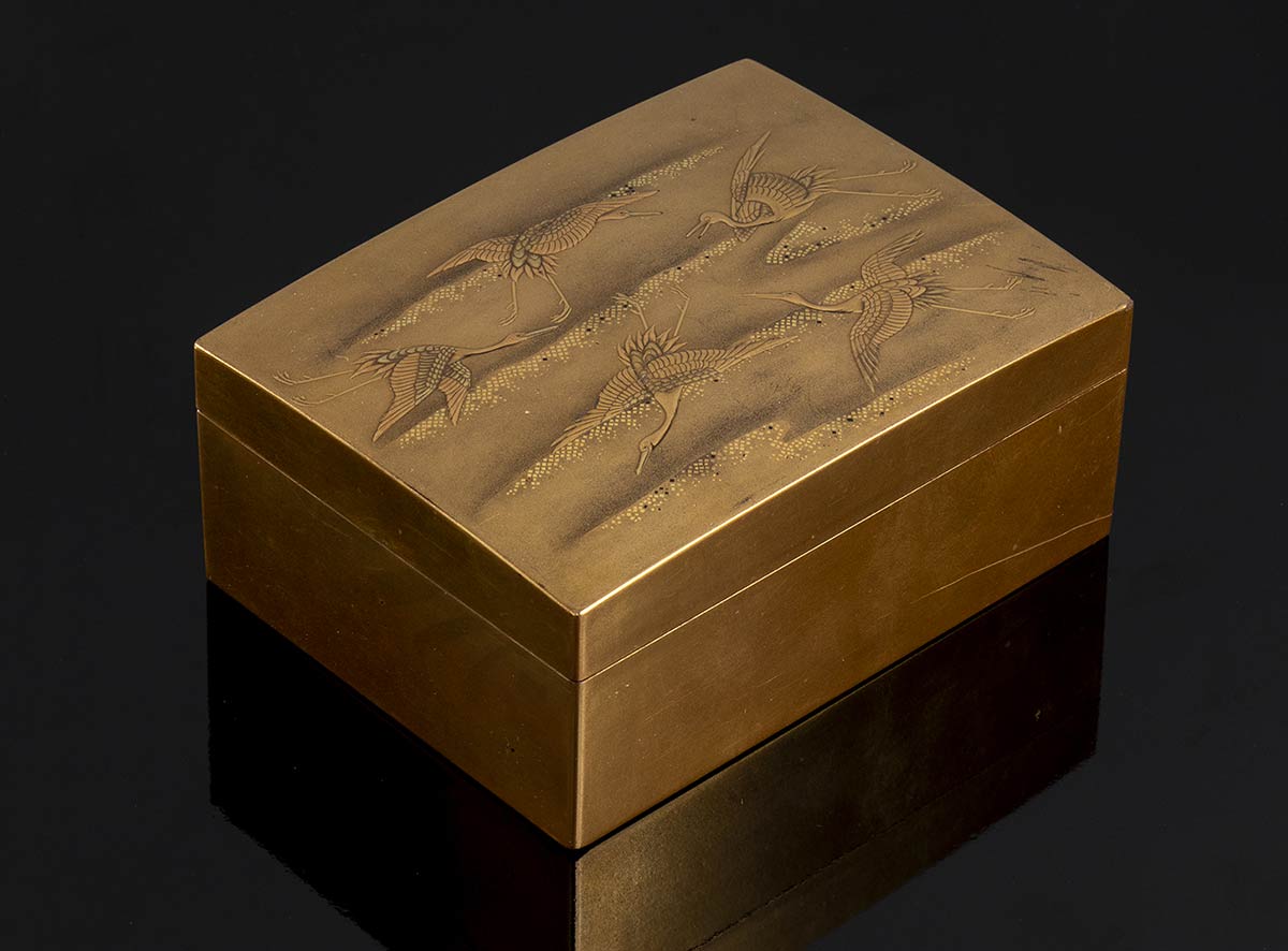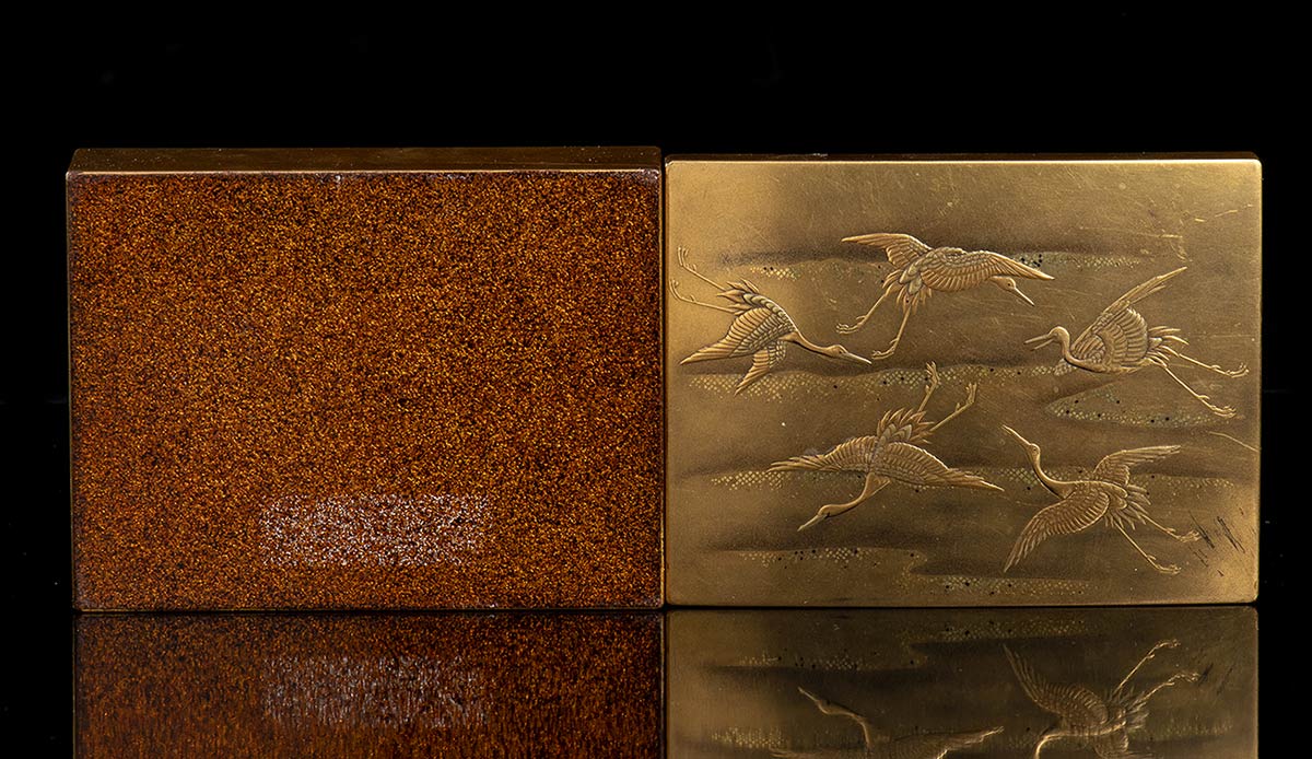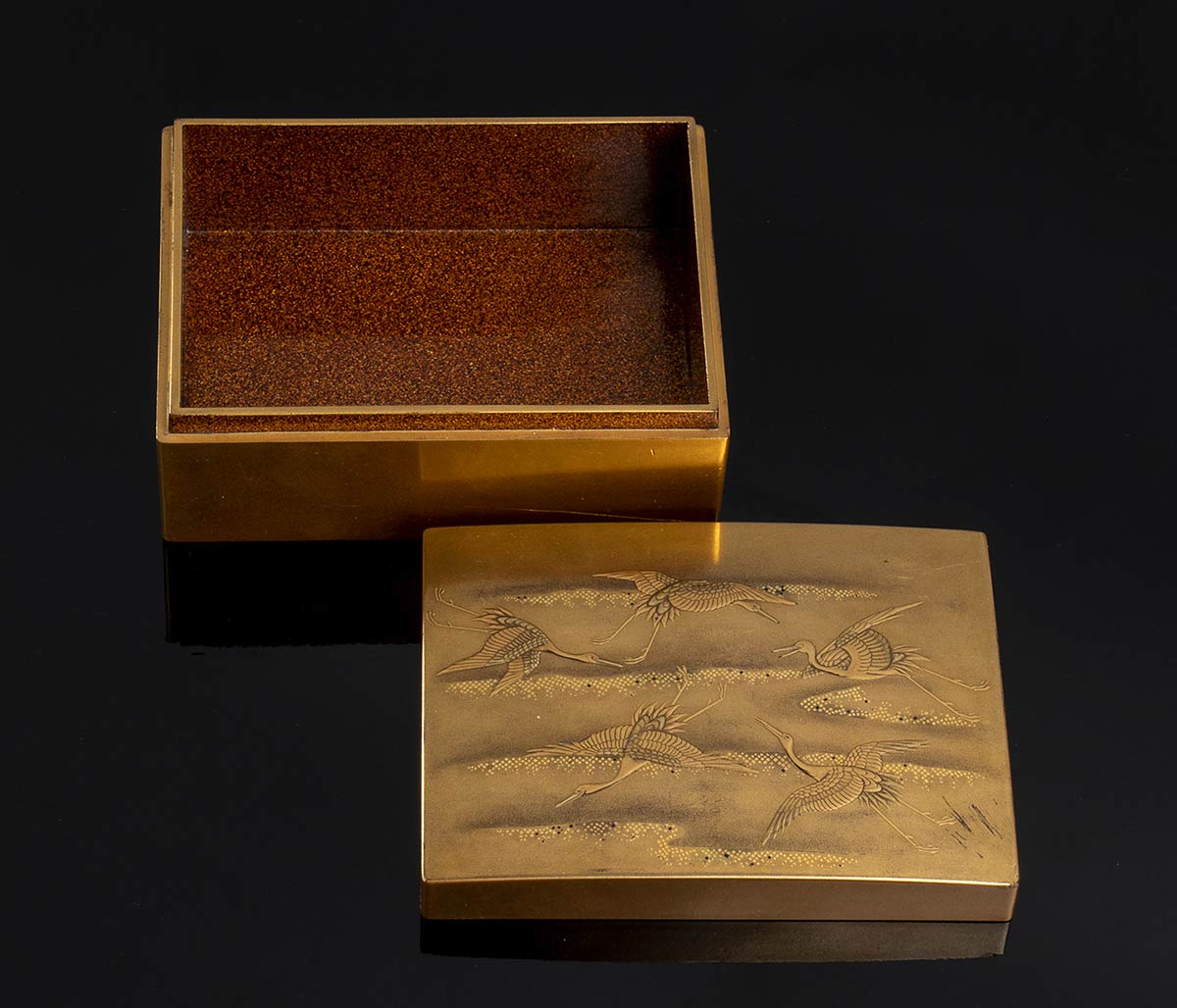 A sezione rettangolare, presenta sulla superficie superiore del coperchio un decoro in hiramaki-e e kirigane di cinque gru in volo, gli altri lati con fondo nashiji.