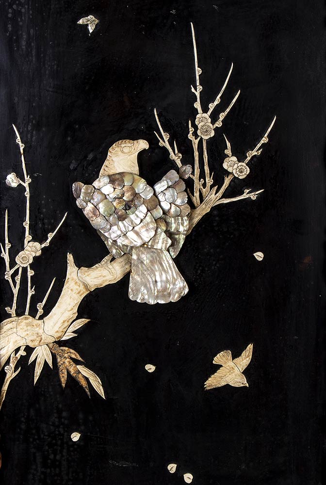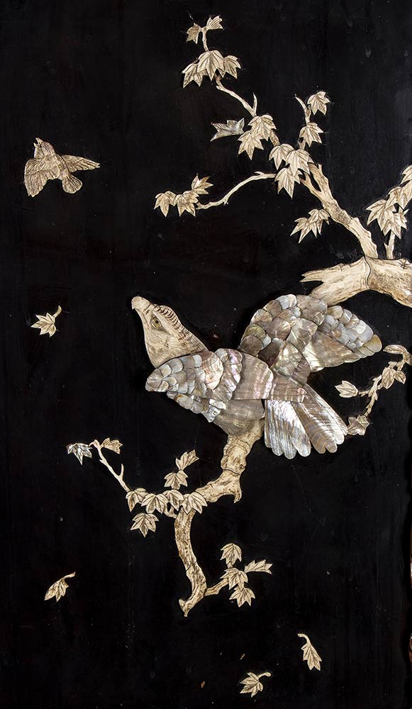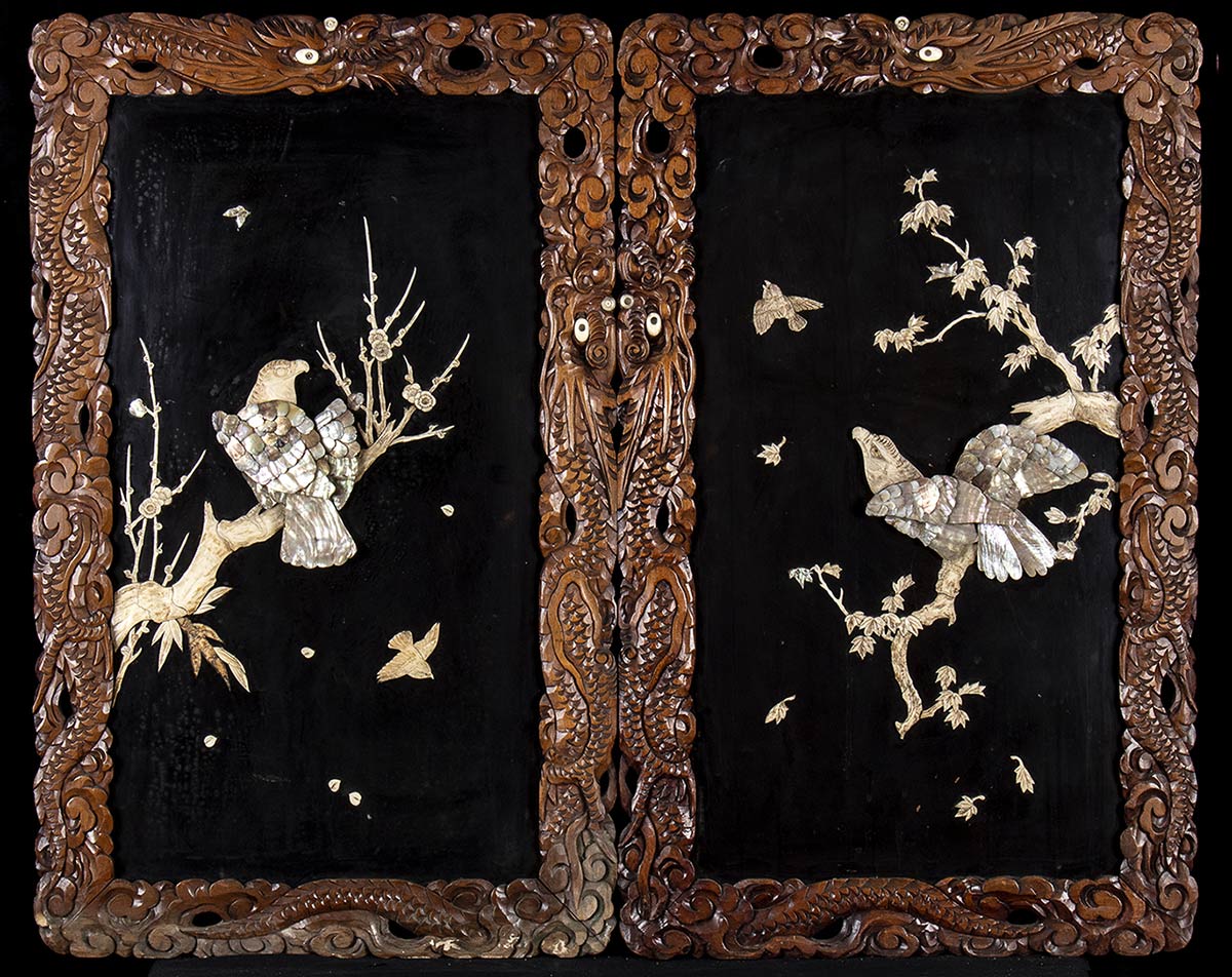COPPIA DI GRANDI PANNELLI IN LEGNO INTAGLIATO E LACCATO CON INTARSI DI MADREPERLA E OSSO