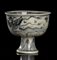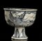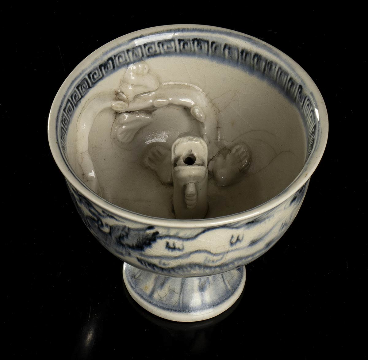 A sezione circolare, l'ampio contenitore posa su stelo a diametro decrescente, la decorazione in blu consiste di petali stilizzati appaiati e sul corpo di una fenice in volo, l'orlo interno con un fregio geometrico, tra parete e fondo un drago in accentuato rilievo con apertura nella bocca in comunicazione con foro al centro della base.