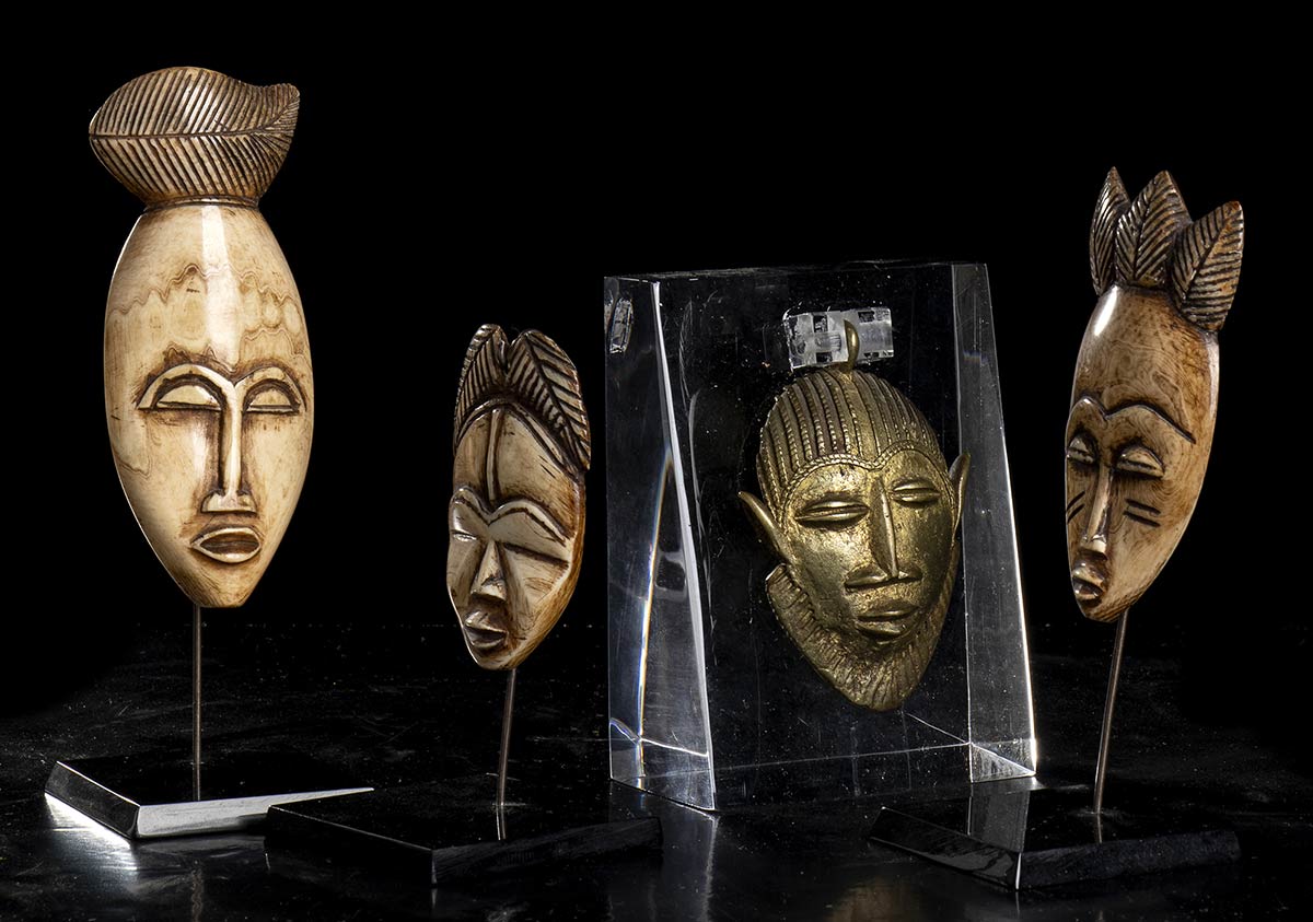 TRE MASCHERE IN MINIATURA IKHOKHO IN AVORIO E UNA PICCOLA MASCHERA IN BRONZO Repubblica Democratica del Congo, Pende