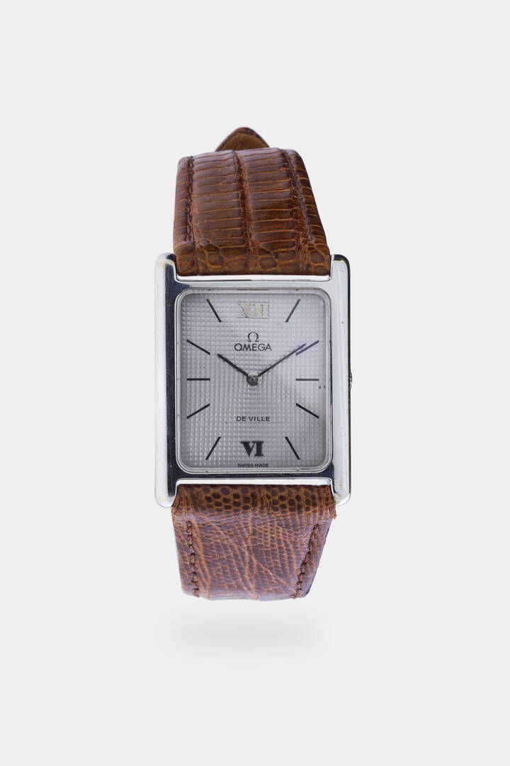 Cassa di forma, placcata in oro bianco, con fondello a scatto. Quadrante guilloché con indici geometrici serigrafati.