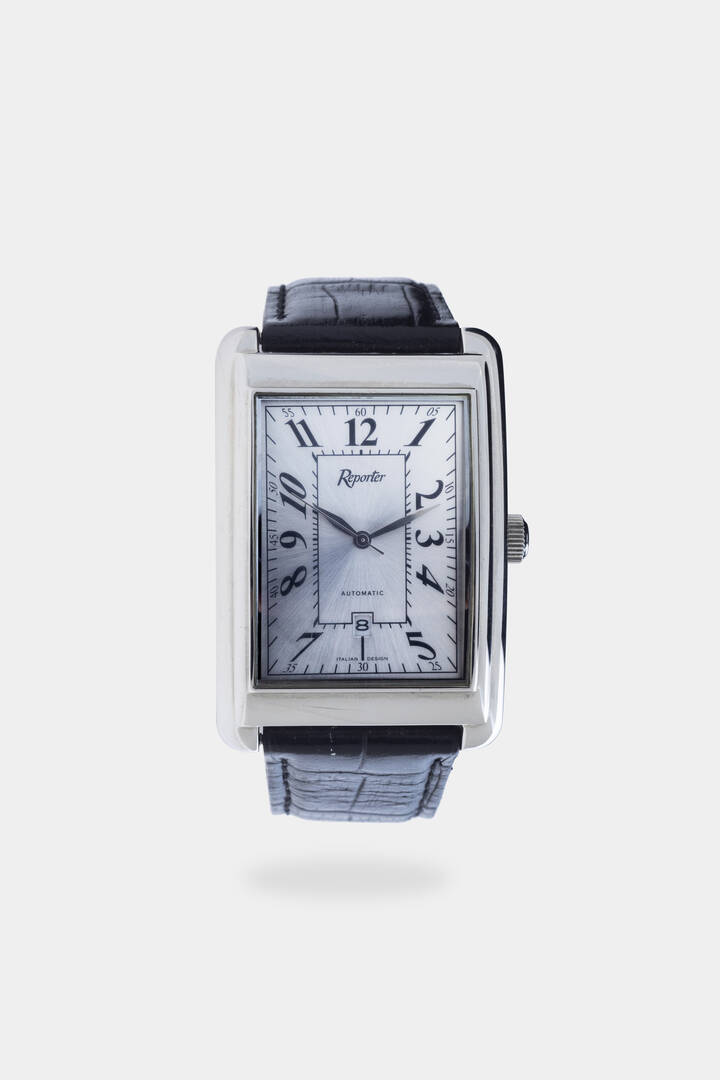 Cassa di forma, in acciaio. Quadrante argento con minuteria e numeri arabi serigrafati. Datario al 6 ed indicazione dei secondi continui al centro.