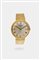 Cassa in oro con fondello a pressione. Quadrante champagne con finitura soleil, numeri romani serigrafati e datario al 3. Bracciale in oro integrato a maglia Milano.