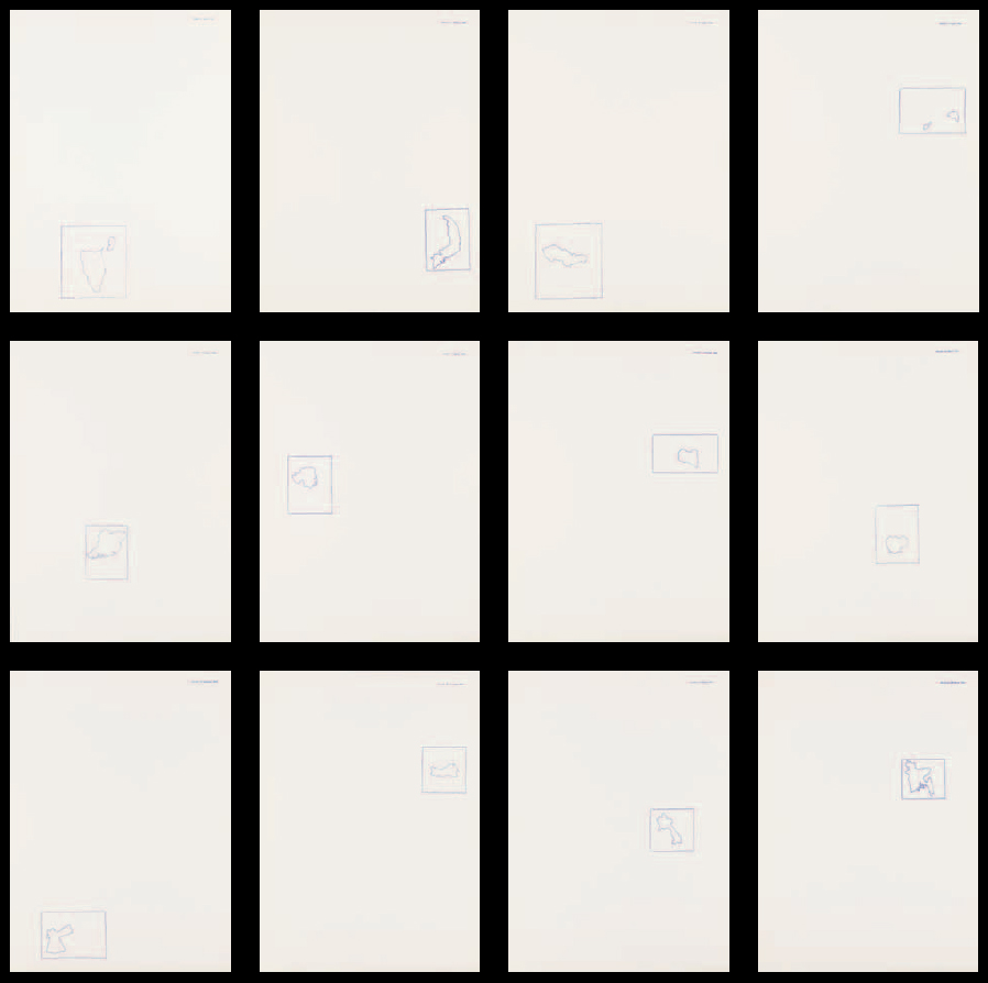 ALIGHIERO BOETTI (1940-1994) 12 forme dal 10 giugno 1967 titolo, dedica e firma 12 forme dal 10 giugno 1967 ad Anna alighiero boetti (sul colophon); numerato e datato 45/99 Boetti (in basso, su ogni foglio) 13 serigrafie stampate su cartoncino usomano bianco (1 colophon + 12 tavole), in scatola di plastica cm 59x42,5 (ciascun foglio); cm 60x43,5 (la scatola) Realizzato nel 1971 in 99 esemplari + 1 bon à tirer, da Edizioni Grafiche Artestudio, Macerata Opera registrata presso l’Archivio Alighiero Boetti, Roma, n. 7197, come da autentica su fotografia in data 6 marzo 2013 (13) P R O V E N I E N Z A : Collezione privata, Modena ivi acquisito dall’attuale proprietario alla fine degli anni Novanta B I B L I O G R A F I A : F. Gualdoni, Arte italiana, Torino 1992, pp. 33-35 Dodici forme dal 10 giugno 1967, in “Temporale”, n. 40-41, Lugano 1996, pp. 2-3 J.C. Ammann, Alighiero Boetti. Opere 1961-1971, Milano 2009, vol. I, p. 279, n. 351 (altro esemplare illustrato)