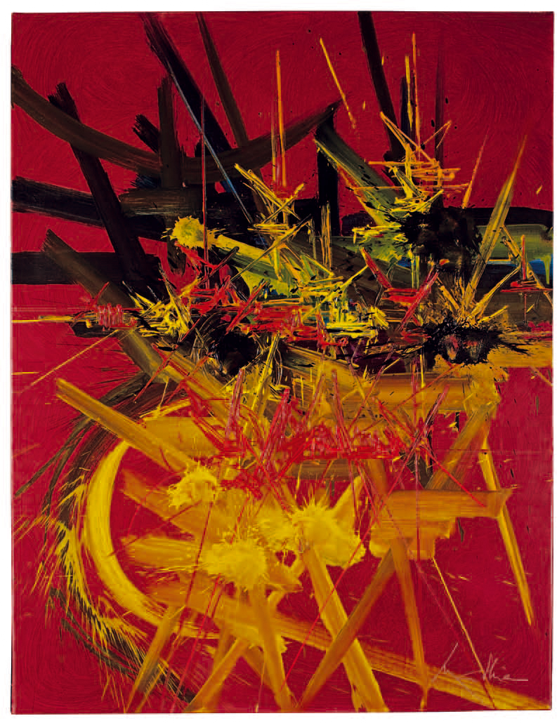 GEORGES MATHIEU (1921-2012) Étoiles de flammes firmato Mathieu (in basso a destra) pittura alchidica su tela cm 130x97 Eseguito nel 1988 Siamo grati al Signor Cusinberche per le informazioni che ci ha gentilmente fornito su quest’opera P R O V E N I E N Z A : Collezione privata, Parigi