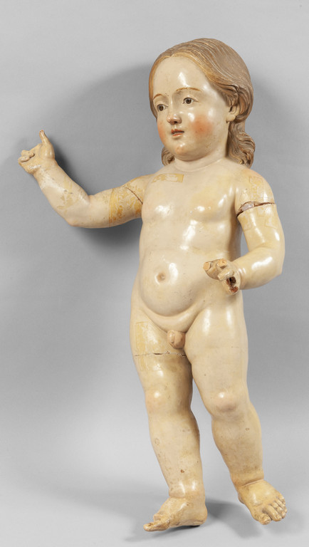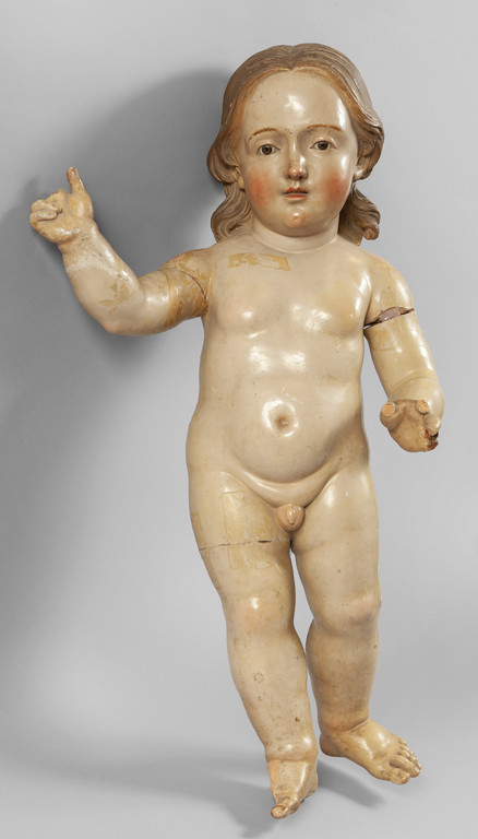 Gesù Bambino grande scultura in terracotta policroma con occhi in vetro Napoli sec.XVIII (piccole mancanze e restauri)
