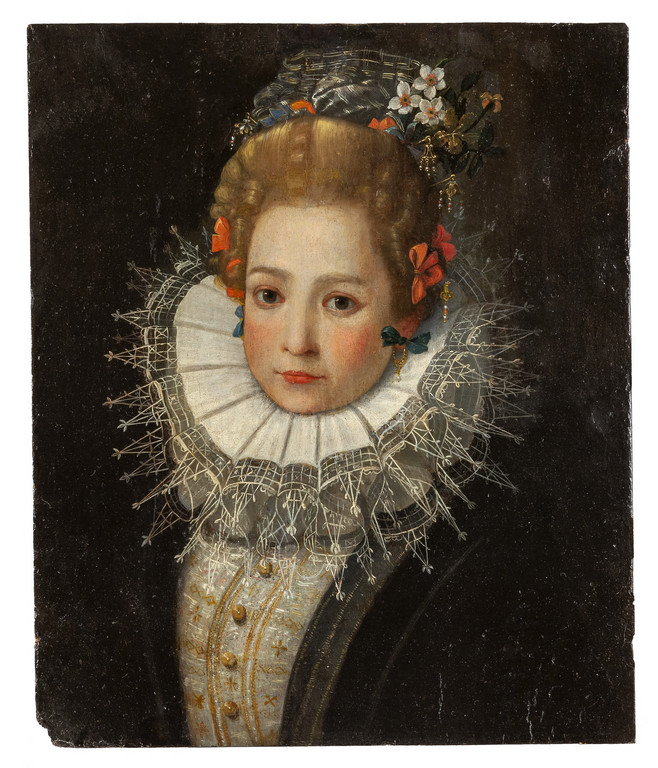 Scuola bolognese sec.XVII 'Ritratto di dama con collare di pizzo' olio su tavola