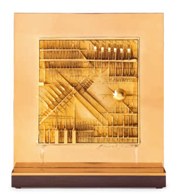 ARNALDO POMODORO (N. 1926) Bassorilievo numerata 16/30 (in basso a sinistra); firmata Arnaldo Pomodoro (in basso a destra) bronzo cm 24,8x23,8x7,8 Realizzata nel 1977 in 30 esemplari + prove d’artista Opera registrata presso l’Archivio Arnaldo Pomodoro, Milano, n. M/77/10 P R O V E N I E N Z A : Rizzoli Finarte, Milano ivi acquisita dall’attuale proprietario nel 1977-78