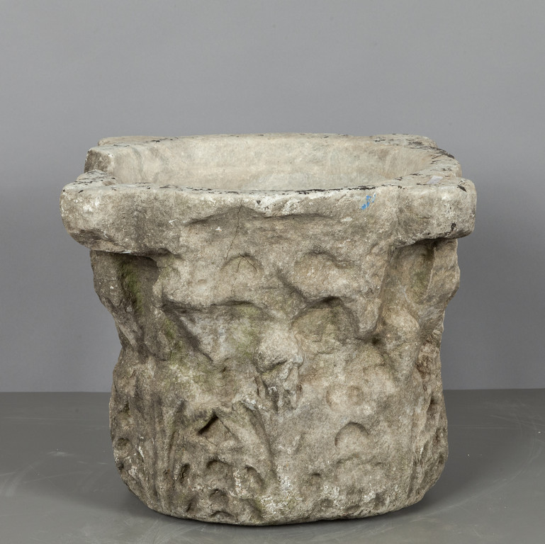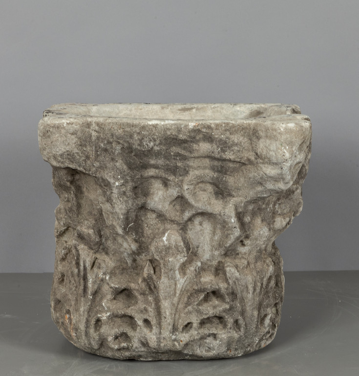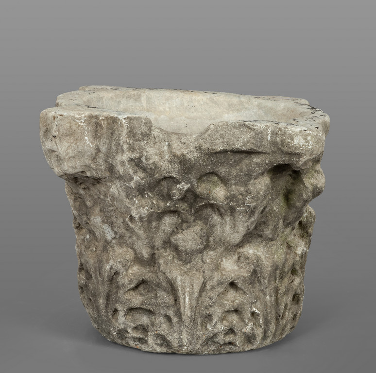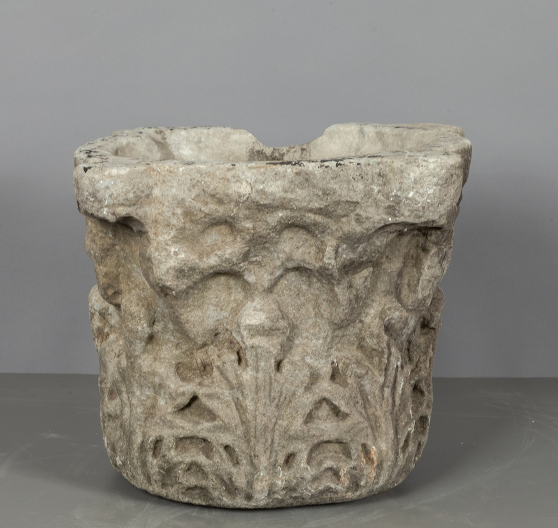 Antico capitello in marmo trasformato in mortaio scolpito a foglie sec.XV