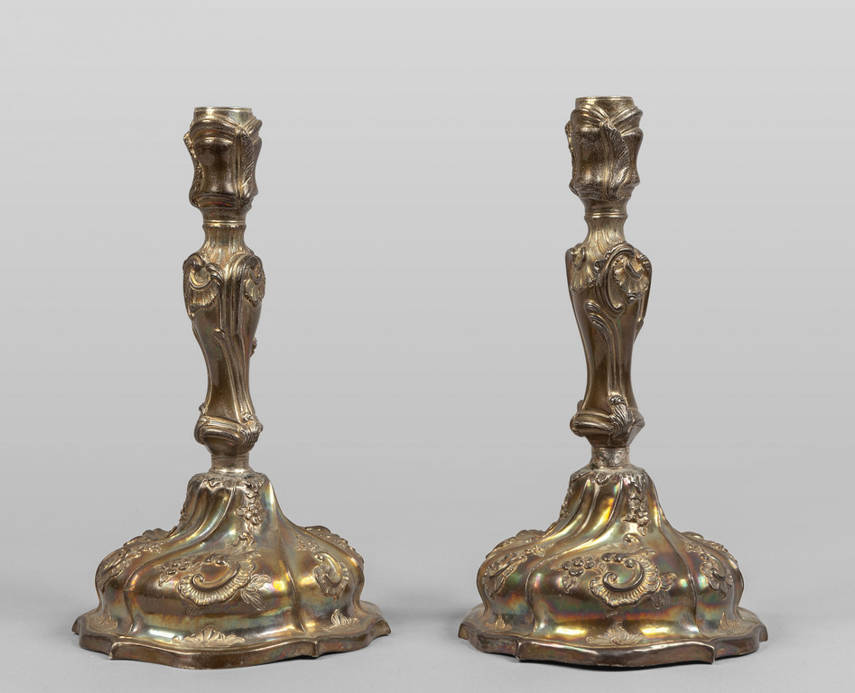 Coppia di candelieri Luigi XV in argento sbalzato con il motivo della pellaccia punzone della Torretta anno 1776 Genova sec.XVIII