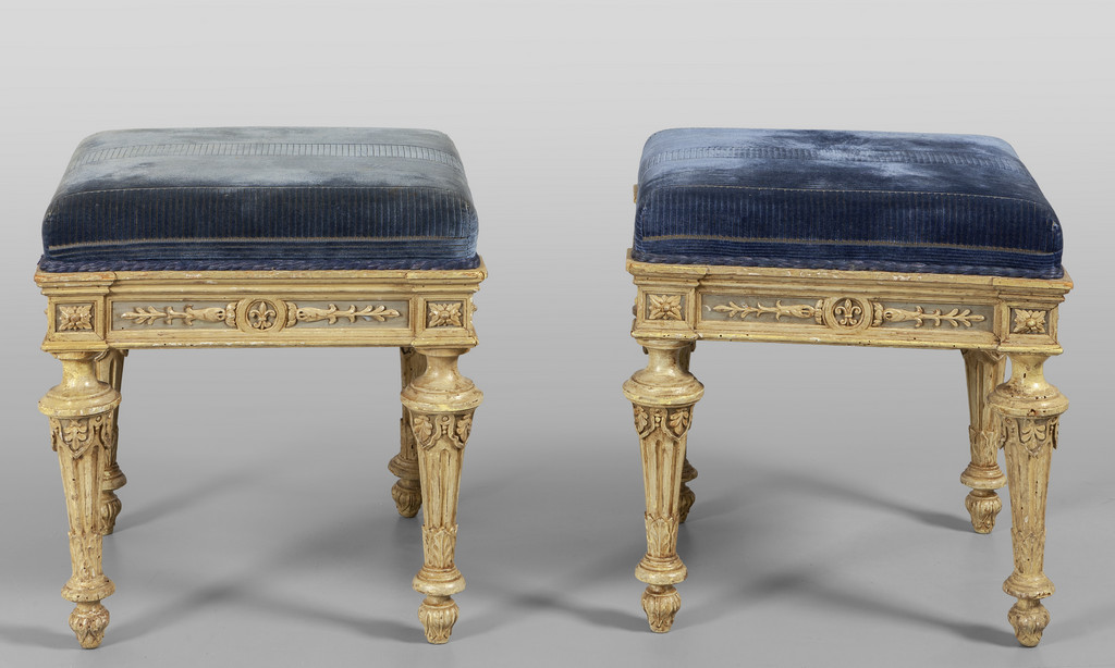 Coppia di sgabelli Luigi XVI in legno finemente intagliato e laccato a doppia policromia Piemonte II metà sec.XVIII