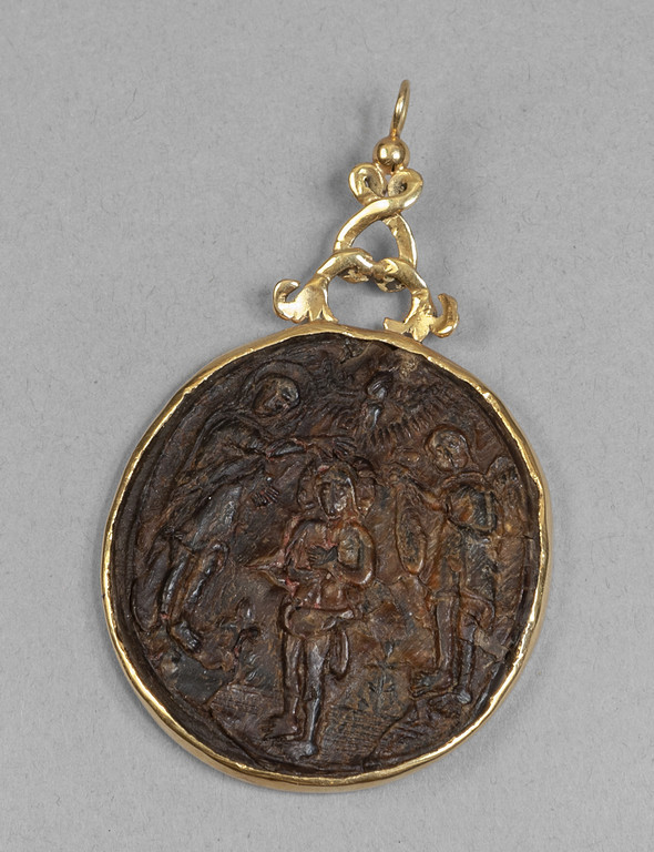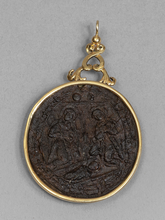 Antica placchetta raffigurante da una parte la Natività e dall'altra la Resurrezione montatura in oro