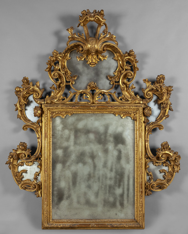 Grande specchiera in legno intagliato e dorato a volute e frutta Italia settentrionale sec. XVIII (mancanze)