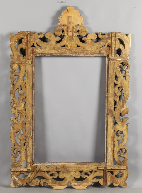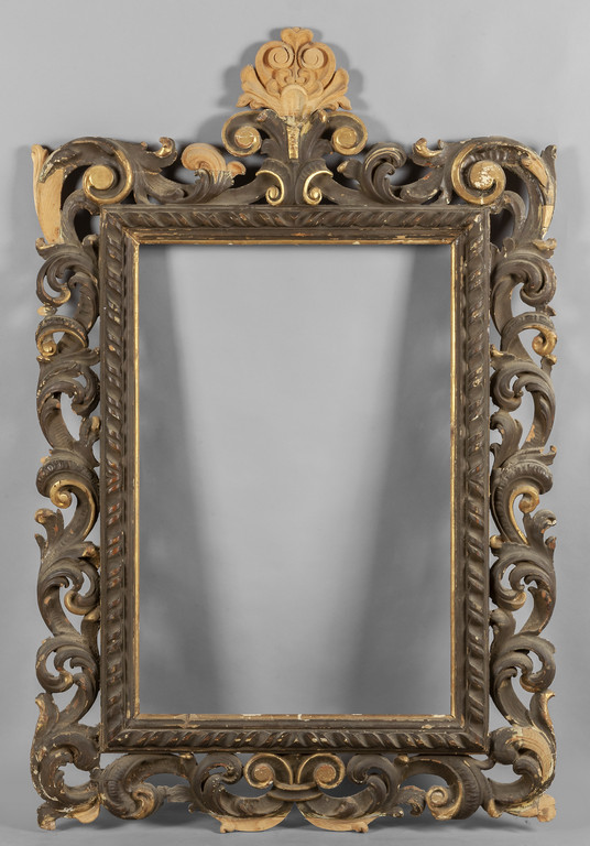 Grande cornice in legno finemente intagliato a grandi volute dorato e laccato Toscana I metà sec.XVIII (restauri)