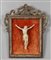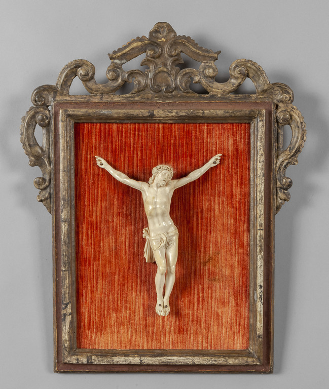 Cristo crocefisso scultura in avorio poggiante su cornice in legno intagliato ed argentato a mecca Francia sec.XVIII