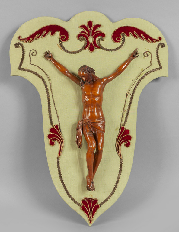 Cristo crocefisso scultura in bosso poggiante su base in stoffa ricamata Genova sec.XVIII