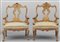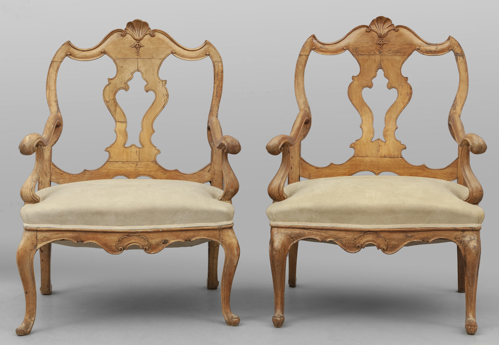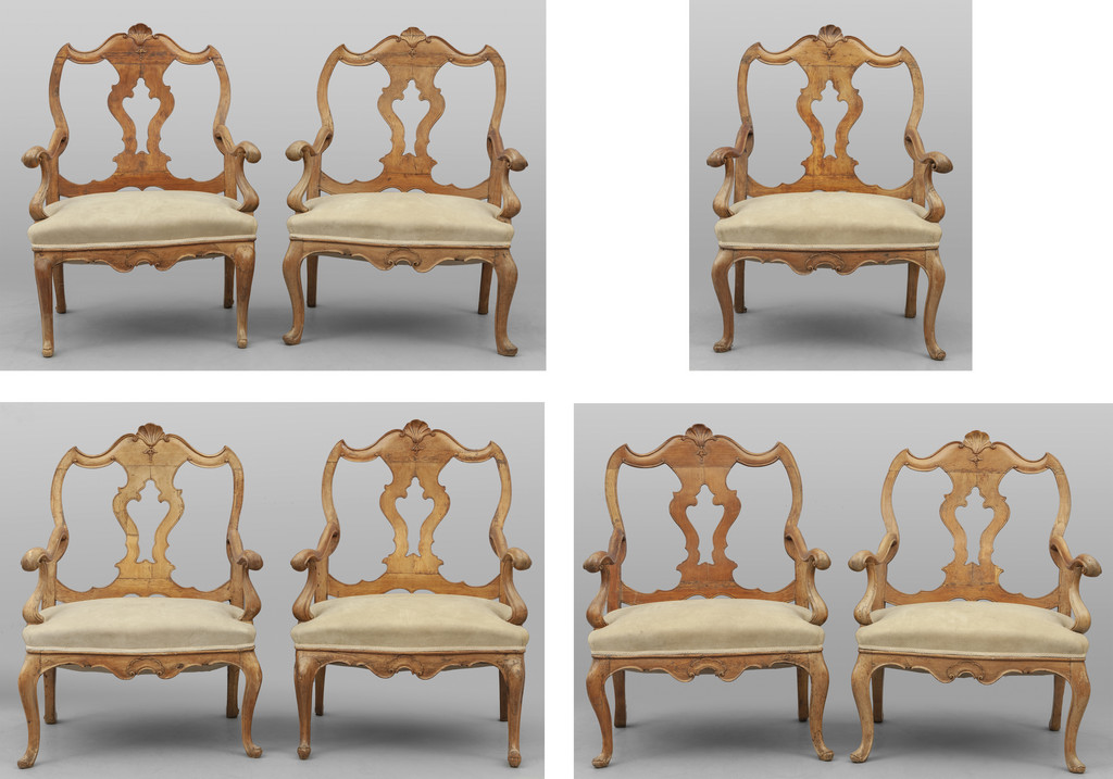 Sette poltrone Luigi XV in noce con schienale a lira traforato cimasa e fascia scolpita Venezia I metà sec.XVIII (restauri)
