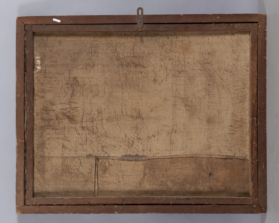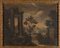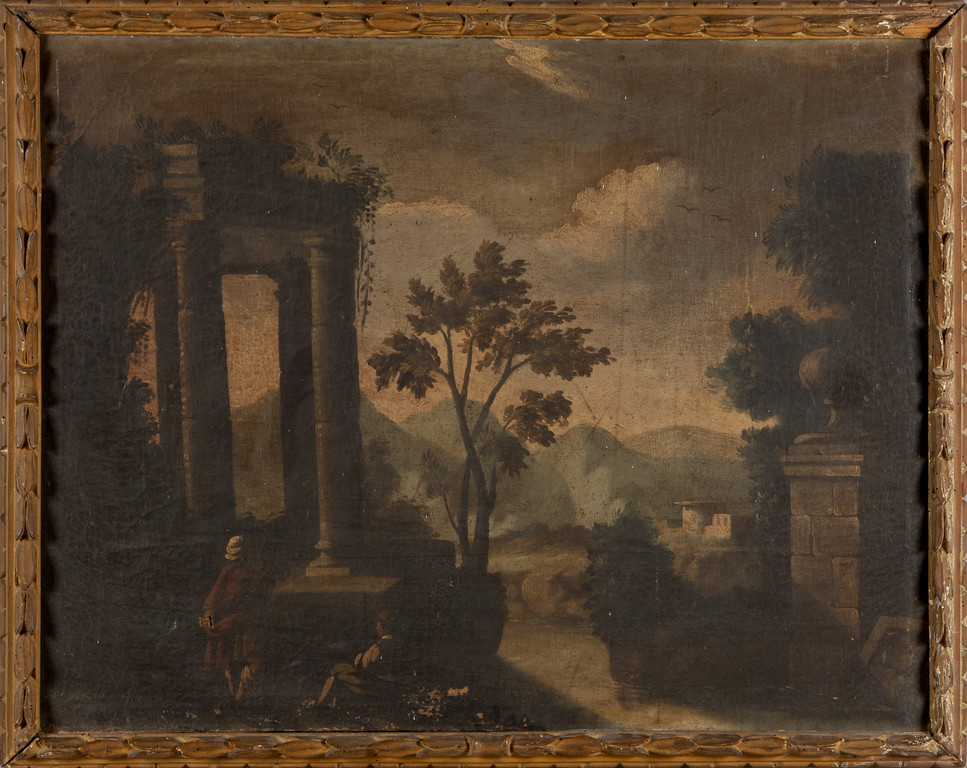 Scuola romana sec.XVII 'Paesaggio animato con figure e rovine' olio cornice coeva in legno intagliato a foglie