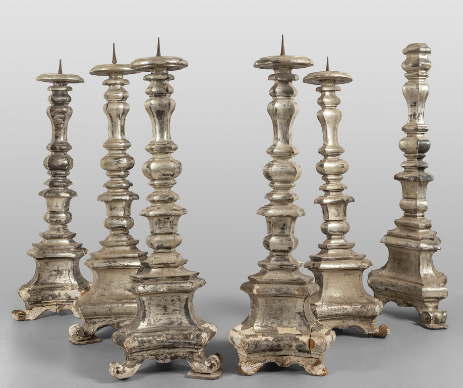 Sei grandi torciere Luigi XIV in legno finemente intagliato ed argentato da centro Toscana I metà sec.XVIII (difetti e mancanze)