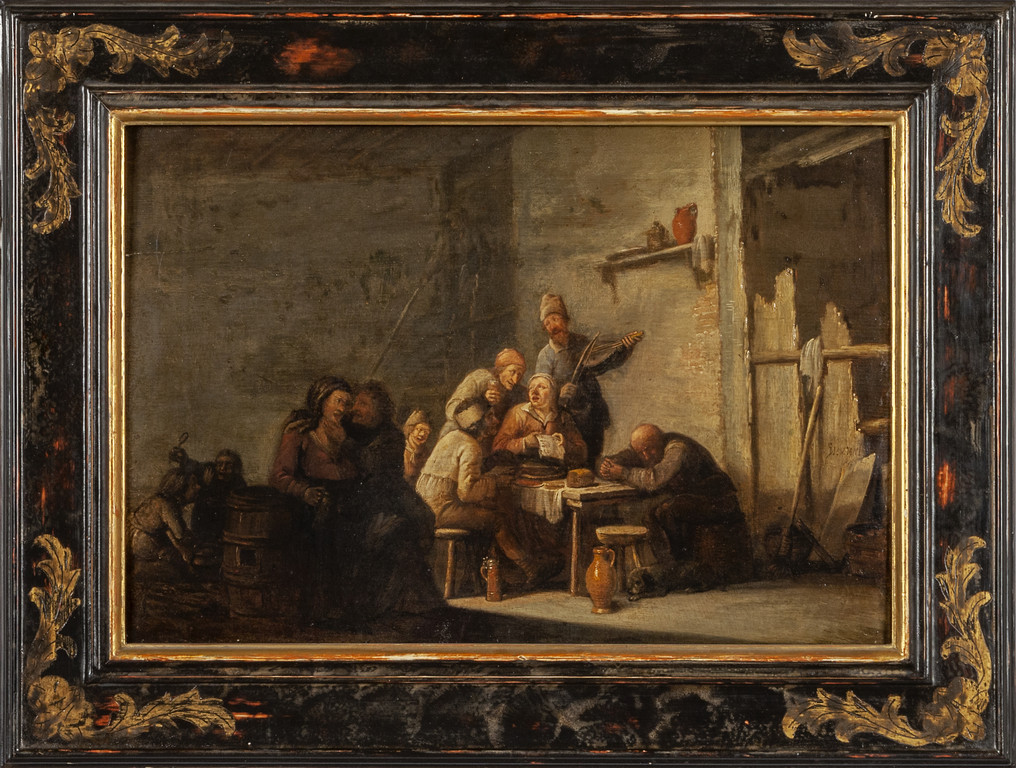 Scuola fiamminga sec.XVII 'Interno di osteria' olio su tavoletta f.to a ds.