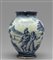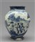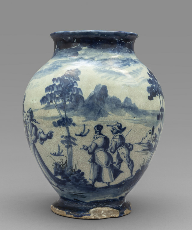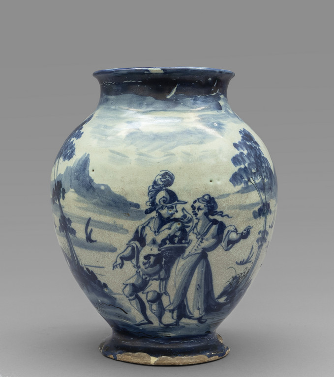 Grande vaso a boccia in ceramica bianca e blu con paesaggio e figure marca Lanterna Savona sec.XVIII