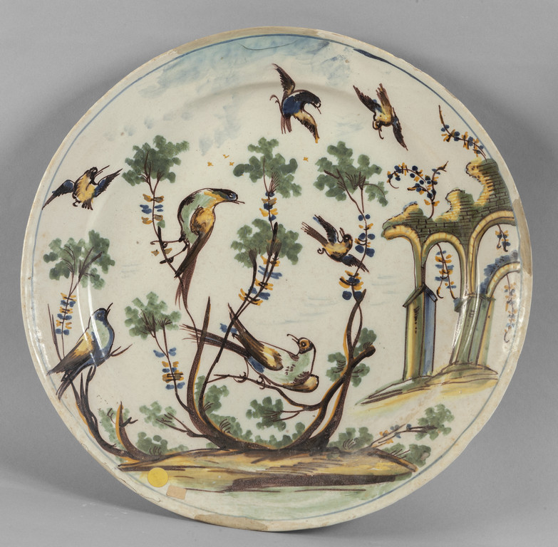 Grande piatto da parata in maiolica decorato con uccellini in policromia Savona sec.XVIII