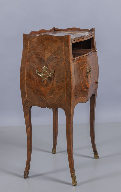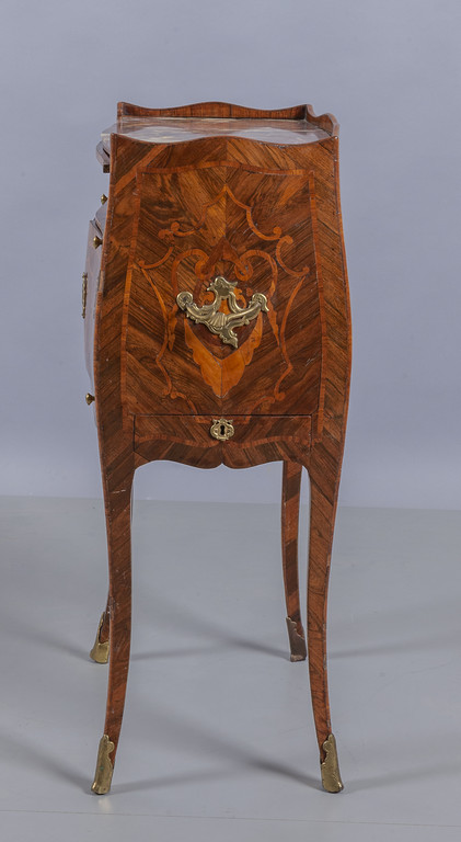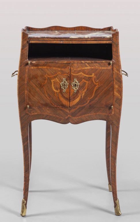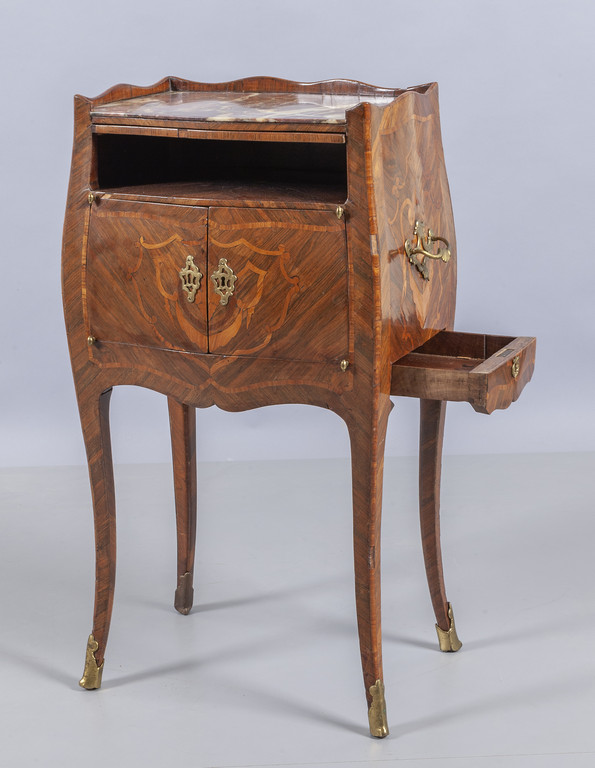 Comodino Luigi XV a due sportelli lastronato in palissandro ed intarsiato a motivi di festoni pianetto scrittoio estraibile un cassetto laterale piano in marmo fior di pesco Genova II metà sec.XVIII