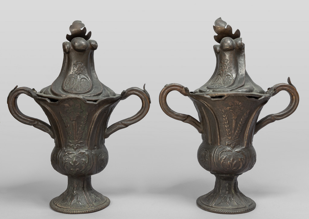 Coppia di vasi in rame sbalzato con manici e coperchi stemmi nobiliari sec.XVIII