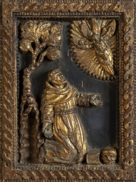 Pannello in legno dorato e scolpito ad altorilievo raffigurante un Santo che riceve le stigmate sec.XVIII