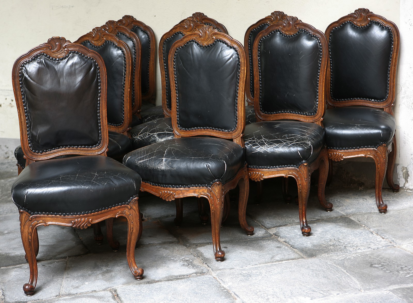 Lotto 57 | N. 10 sedie intagliate, con rivestimento in pelle. Legno e pelle. .