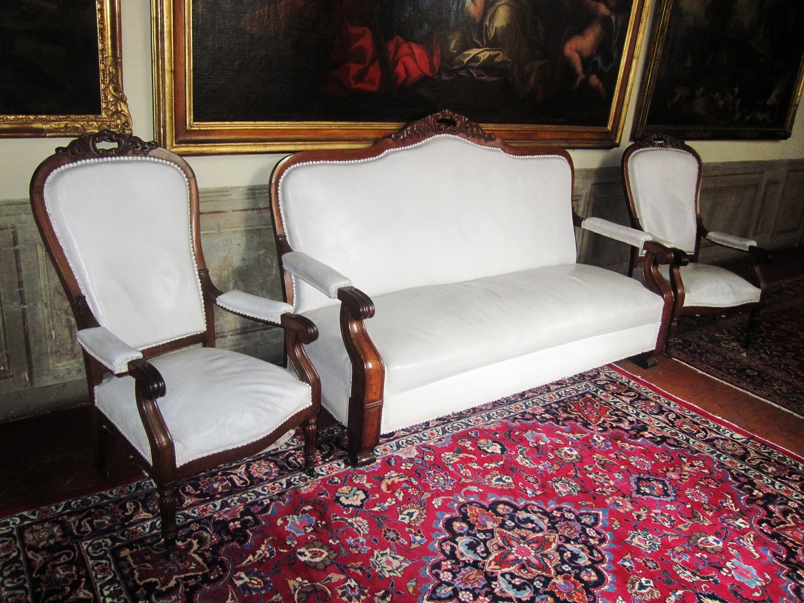 Lotto 58 | N. 1 divano e n. 2 poltrone rivestite in pelle bianca. Legno e pelle. .