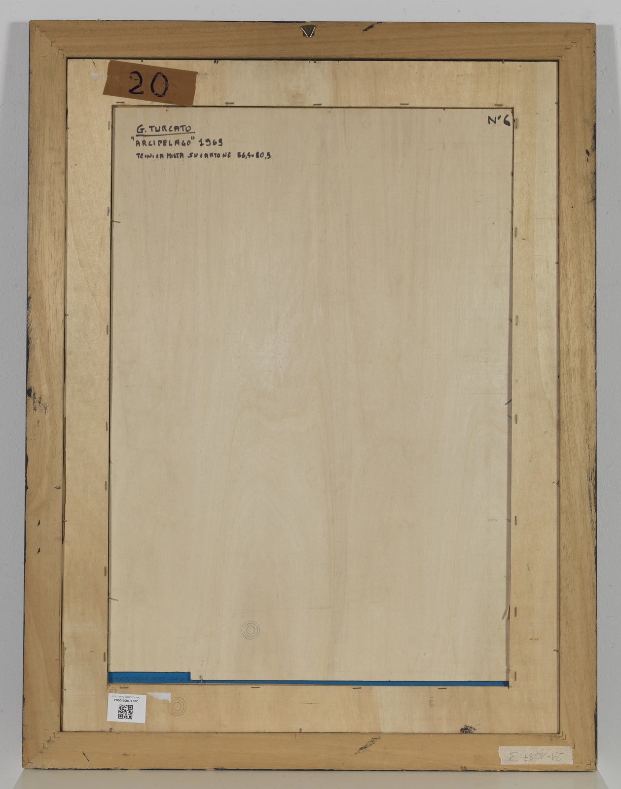 TURCATO GIULIO (1912 - 1995) Composizione. Tecnica mista su cartone. Cm 56,50 x 80,50. Opera archiviata presso l'Archivio Giulio Turcato, Roma, come da documentazione allegata all'opera riportante il relativo numero d'inventario. Cornice presente