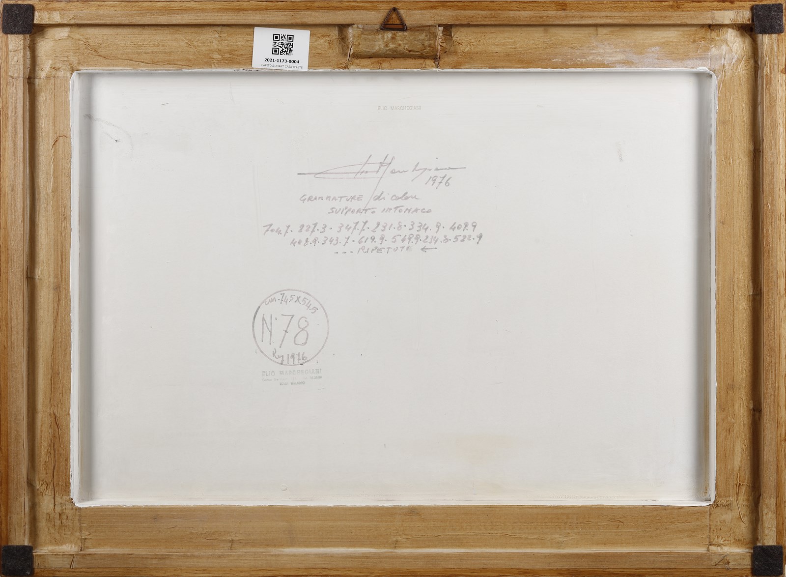 MARCHEGIANI ELIO (n. 1929) Grammature di colore. 1976. Acrilico su intonaco. Cm 74,50 x 54,50. Al retro titolo, firma, anno e timbro dell'artista. Autentica dell'artista su fotografia. Cornice presente