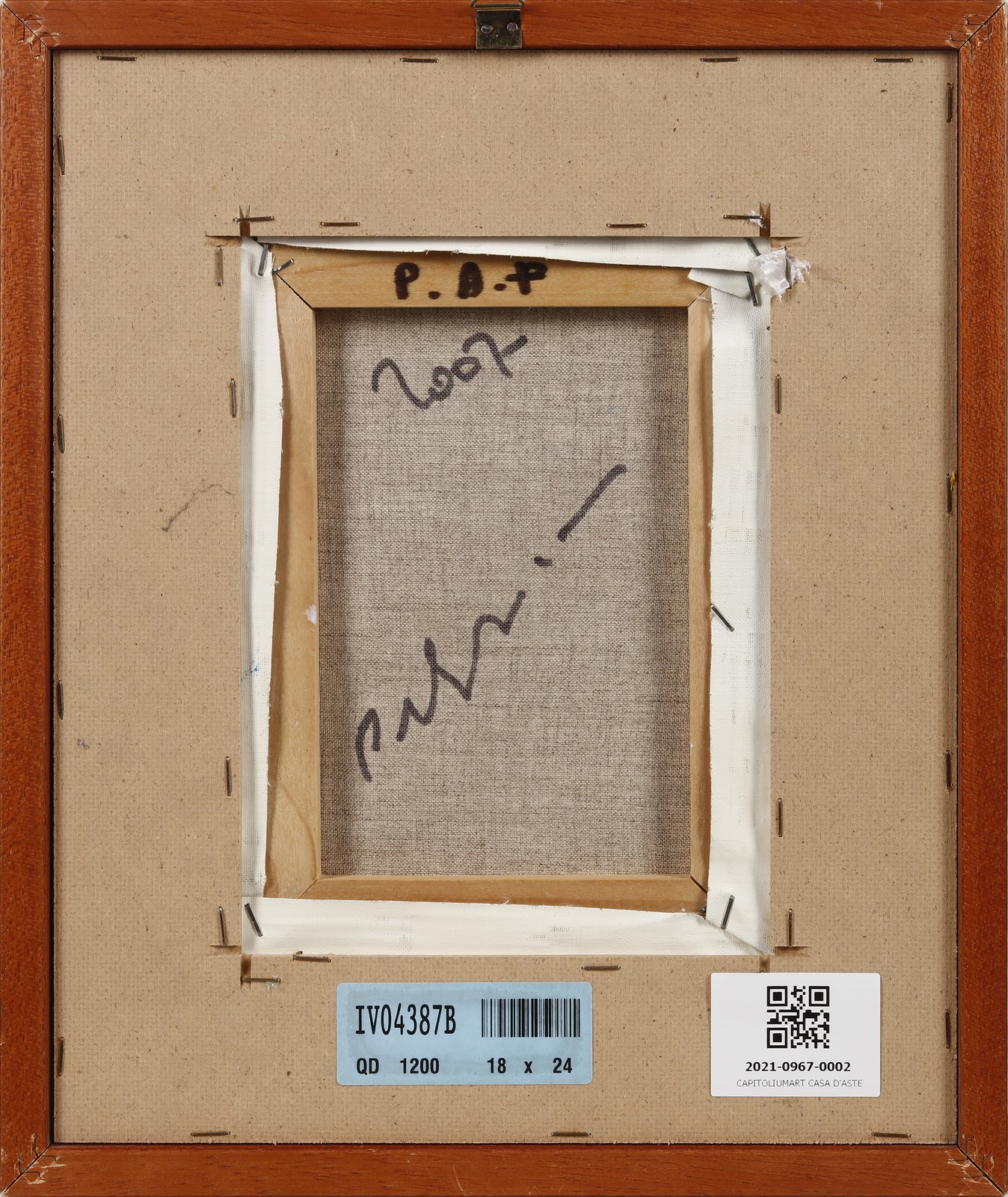 PAGLIACCI MIRKO (n. 1959) Pret art porter. 2007. Tecnica mista su tela. Cm 18,00 x 24,00. Al retro firma e anno. Autentica dell'artista su fotografia. Certificato di provenienza StockMarket, Milano. Cornice presente