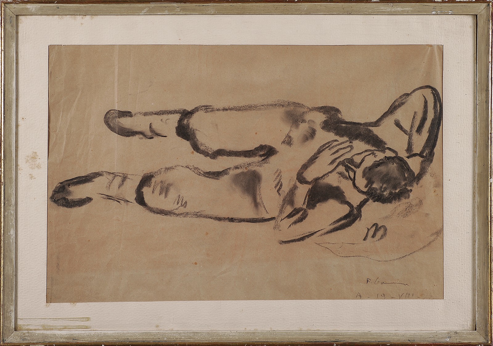 CARENA FELICE (1879 - 1966) Uomo sdraiato. Carboncino su carta. Cm 52,50 x 34,50. Firma in basso a destra. Piegature della carta nella parte sinistra. Cornice presente