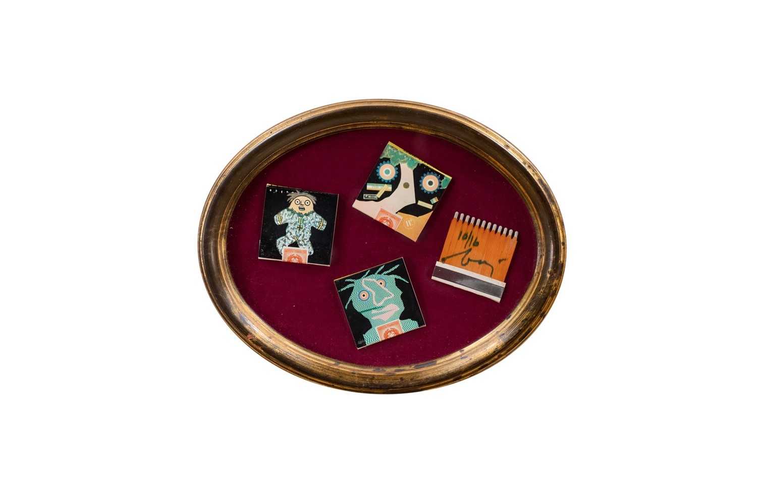 quattro scatole di cerini entro cornice ovale, es. 10/16