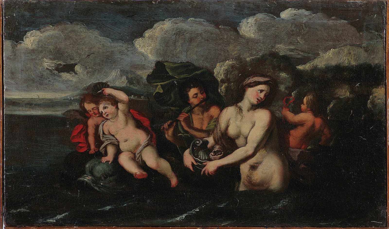 Venere anadiomene. Olio su tela . Cm 58,00 x 35,50. XVII secolo. Vecchio rintelo. Presenti restauri concentrati nella parte alta in corrispondenza delle nubi.