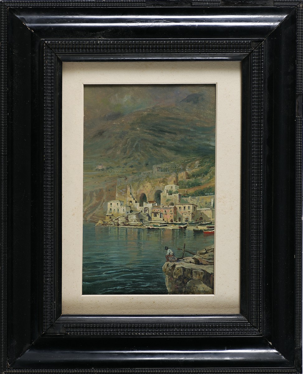 PETRUOLO SALVATORE (1857 - 1946) Veduta di paesaggio costiero. Olio su cartone telato. Cm 18,00 x 29,50. Firma in basso a destra. Cornice presente