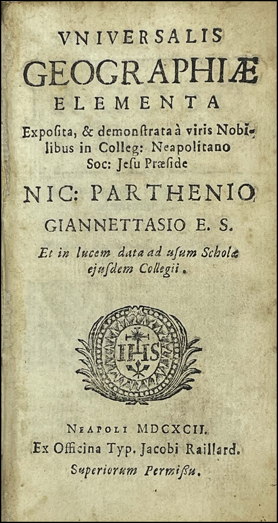 Giannettasio Niccolo Partenio. Universalis cosmographiae elementa exposita & demonstrata a viris nobilibus In Colleg. Neapolitano S. Jesu, praeside Nic. Parthenio Giannettasio. Neapoli, ex officina typ. Jacobi Raillard, 1688