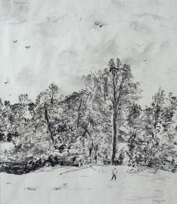 Mario Cavaglieri (Rovigo, 1887 - Peyloubère -par- Pavie, 1969) PAESAGGIO CON FIGURE Inchiostro e matita su carta, cm. 42x37