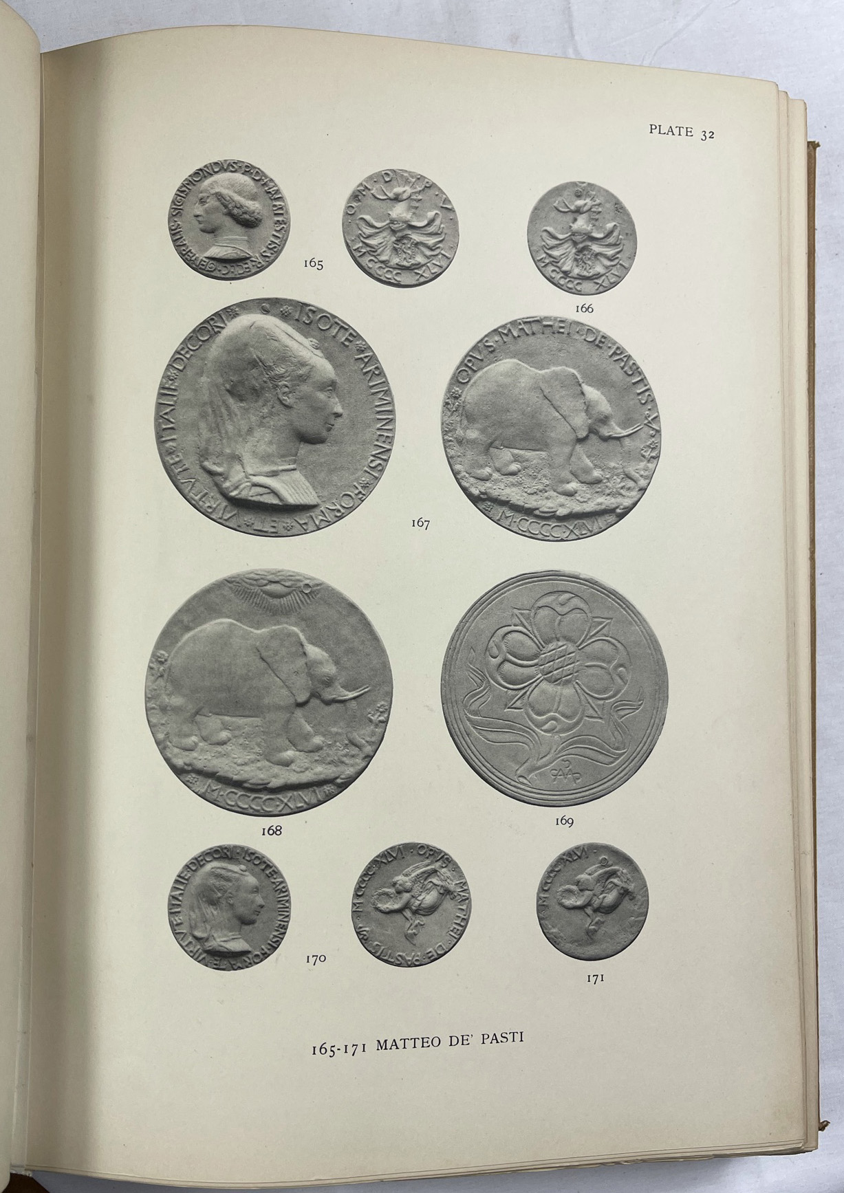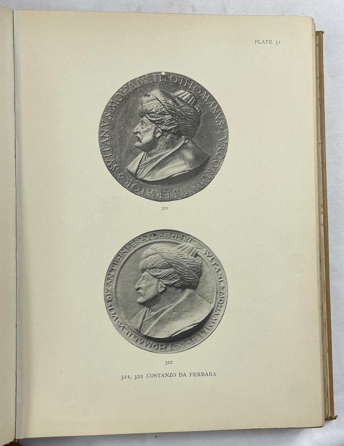 Fundamental work of numismatics consisting of a volume of text and one of tables, with 201 beautiful plates depicting more than a thousand Italian medals from 1390 to 1530.