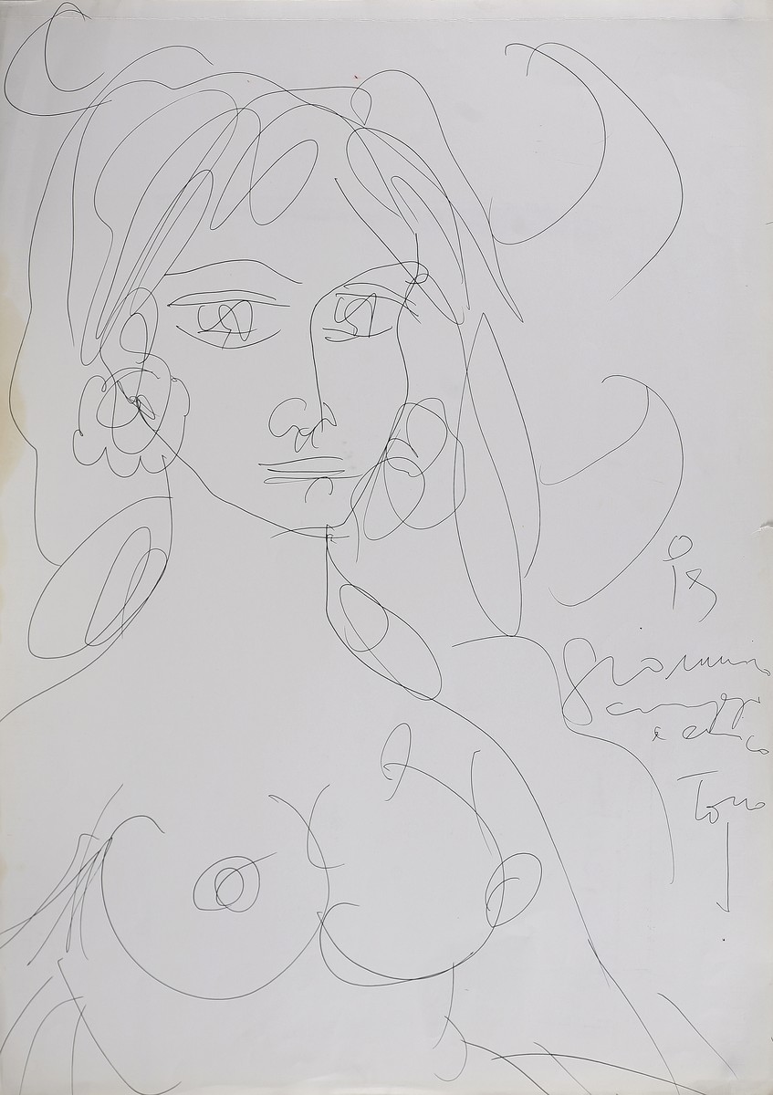 ZANCANARO TONO (1906 - 1985) Senza titolo. Biro su carta. Cm 48,00 x 66,00. Firma e dedica a sinistra.